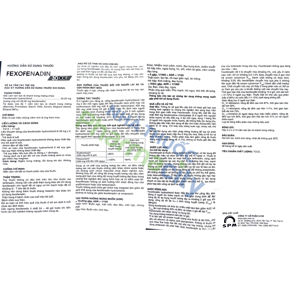 - Hoạt chất:Fexofenadin hydrochlorid 30mg