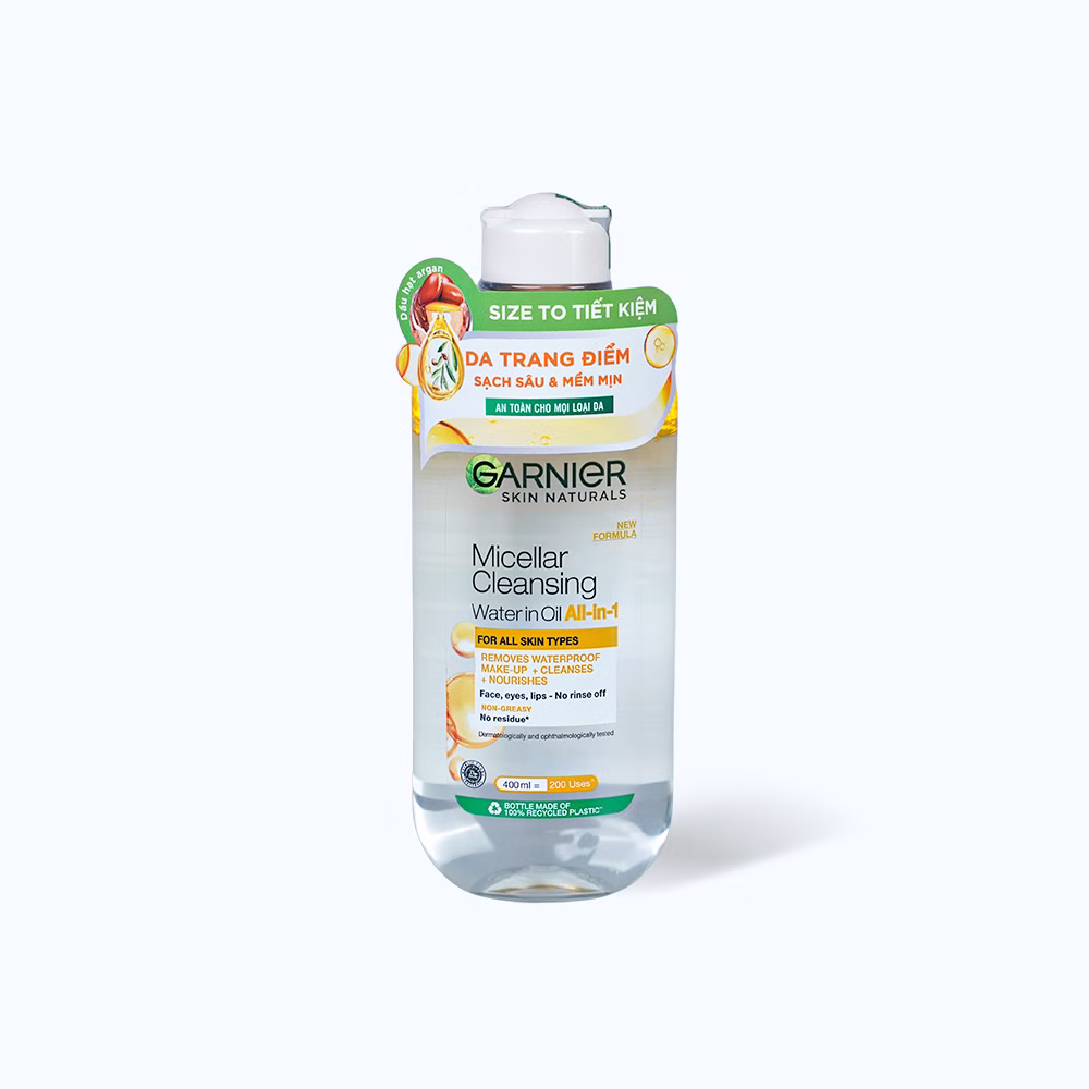 Nước tẩy trang dành cho da trang điểm Garnier Skin Naturals Micellar Oil-infused Cleansing Water là sản phẩm tẩy trang nổi tiếng đến từ thương hiệu Garnier của Pháp. Sản phẩm là sự kết hợp từ dưỡng chất dầu Argan tự nhiên cùng công nghệ Micellar hoạt động trên các phân tử mi-xen theo cơ chế nam châm có khả năng làm sạch sâu cho da giúp loại bỏ cả các lớp trang điểm “cứng đầu” nhất. Đồng thời còn kiểm soát sản xuất bã nhờn, dưỡng ẩm và nuôi dưỡng làn da mềm mại, ngăn chặn tình trạng mất nước và lão hóa trên da.