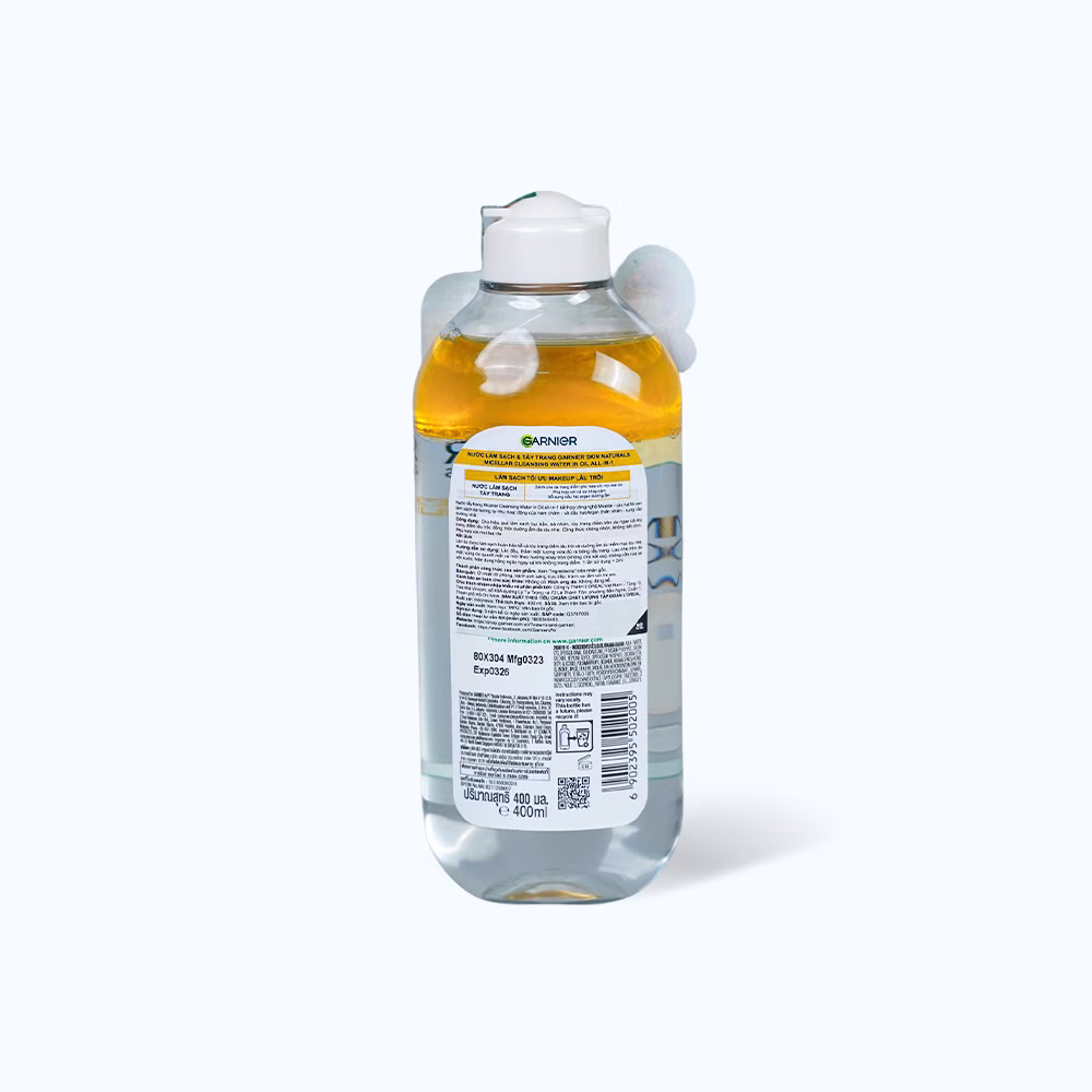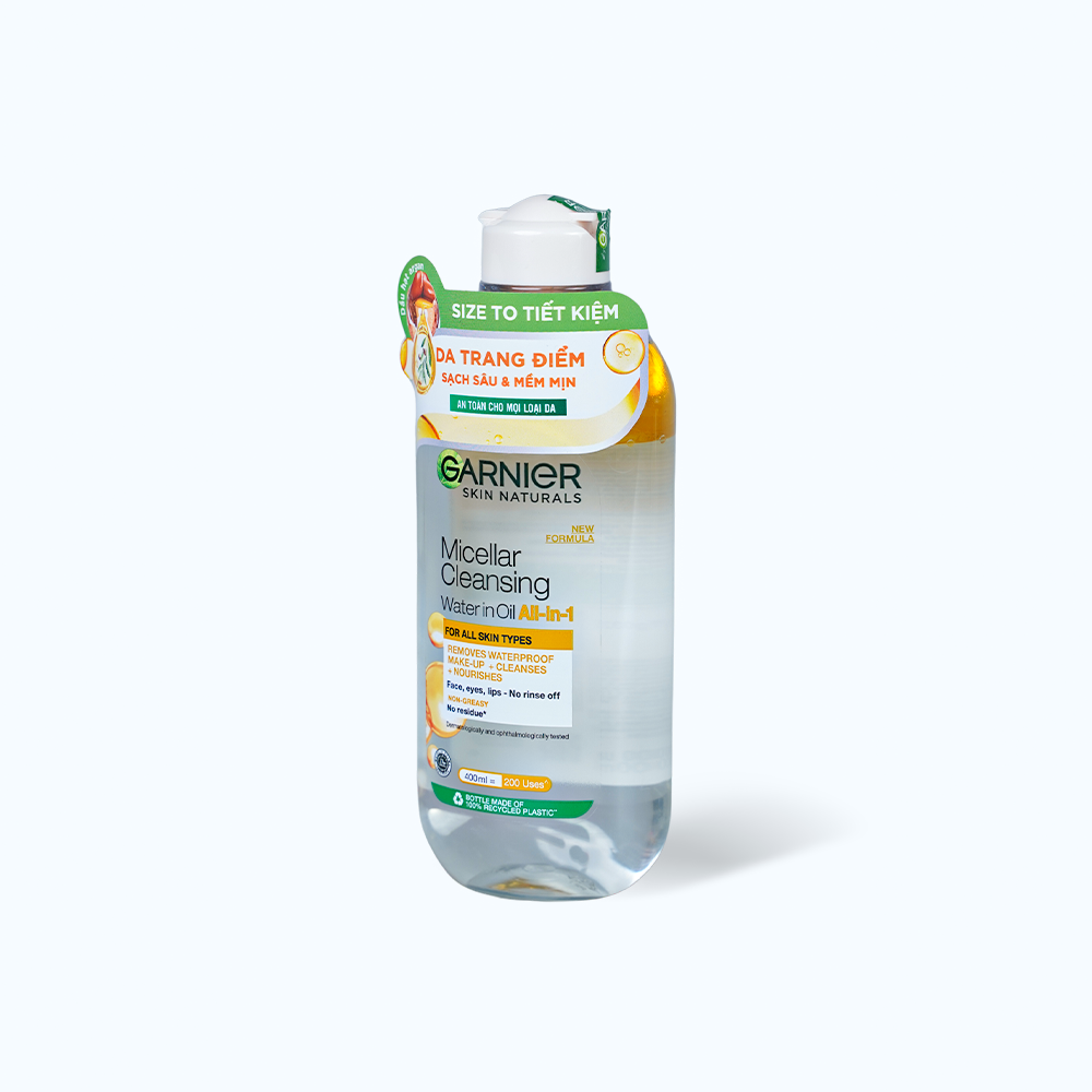 Nước tẩy trang Garnier Skin Naturals Micellar Oil-infused Cleansing Water là dòng tẩy trang dầu nước chuyên dụng dành cho những làn da thường xuyên phải trang điểm, kết hợp công nghệ Micellar có chứa các phân tử mi-xen giúp loại bỏ bụi bẩn từ sâu bên trong lỗ chân lông mà không gây khô da. Nước tẩy trang Garnier Skin Naturals Micellar Oil-infused Cleansing Water giúp nhẹ nhàng làm sạch các lớp trang điểm không trôi, dùng được cho cả các vùng da như vùng mắt và môi. Sản phẩm còn này có khả năng xử lý lớp trang điểm đậm, son lì, phấn mắt, mascara chống thấm nước…, những không làm mất đi độ ẩm vốn có của da. Có thể nói, đây là sản phẩm nước tẩy trang toàn diện và đa dụng nhất từ trước đến nay.