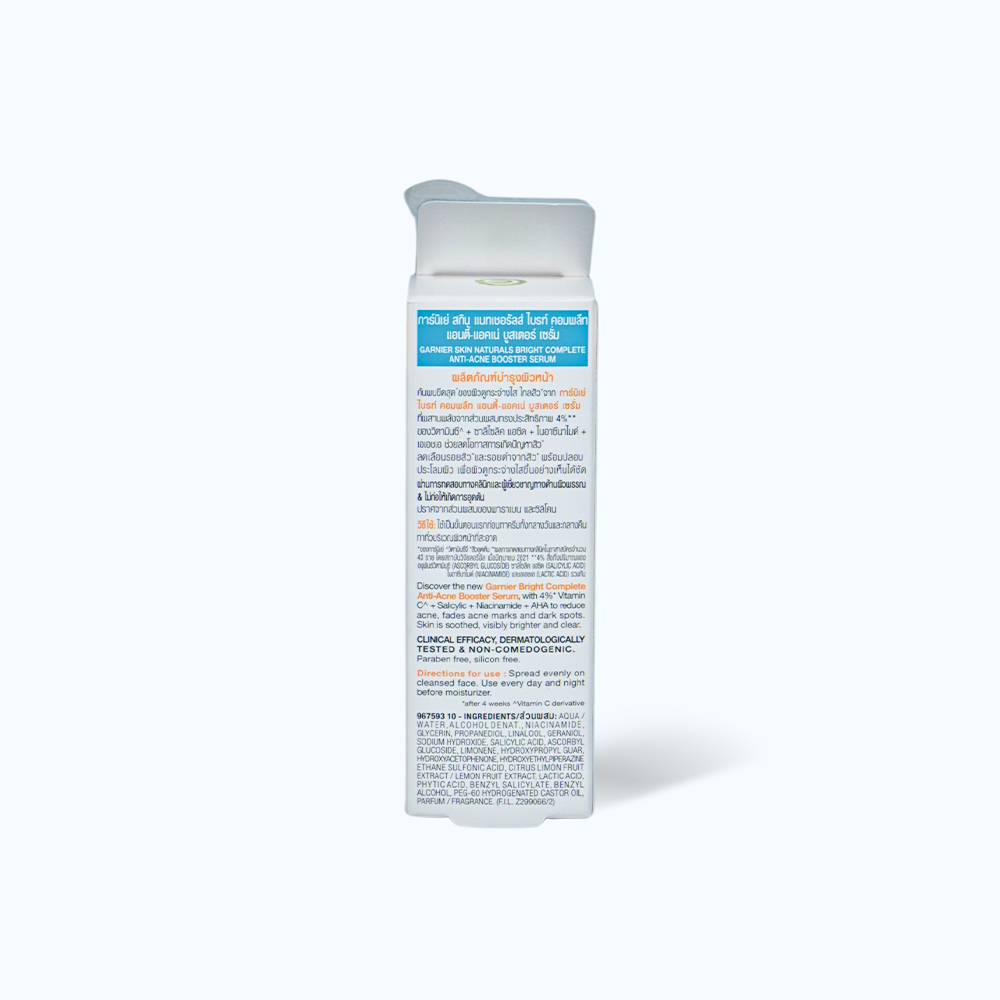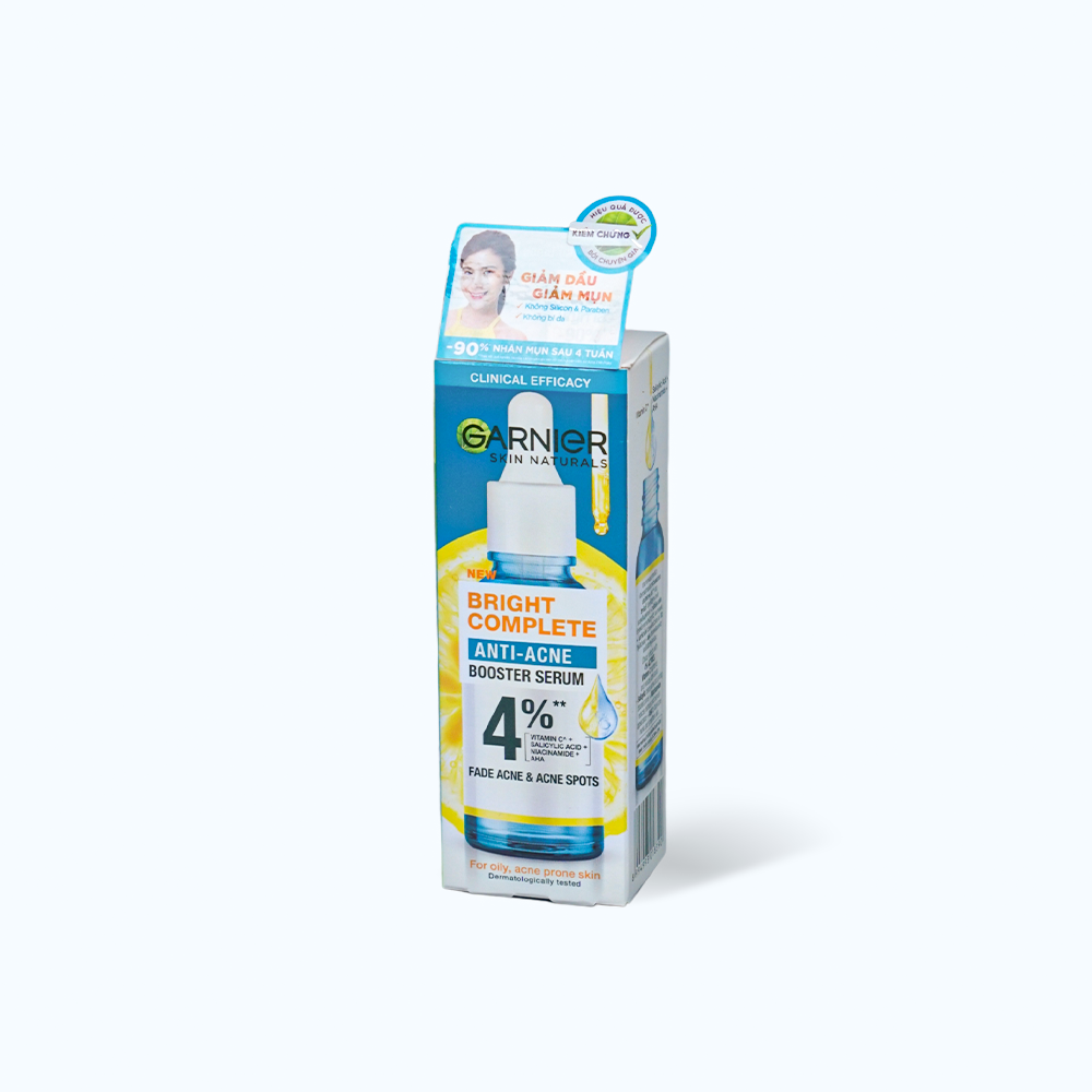 Tinh chất giảm mụn sáng da Garnier Skin Naturals Bright Complete Anti-Acne Booster Serum với công thức 4% [Vitamin C + BHA Salicylic + Niacinamide + AHA] giúp giảm mụn và làm giảm vết thâm sau mụn.