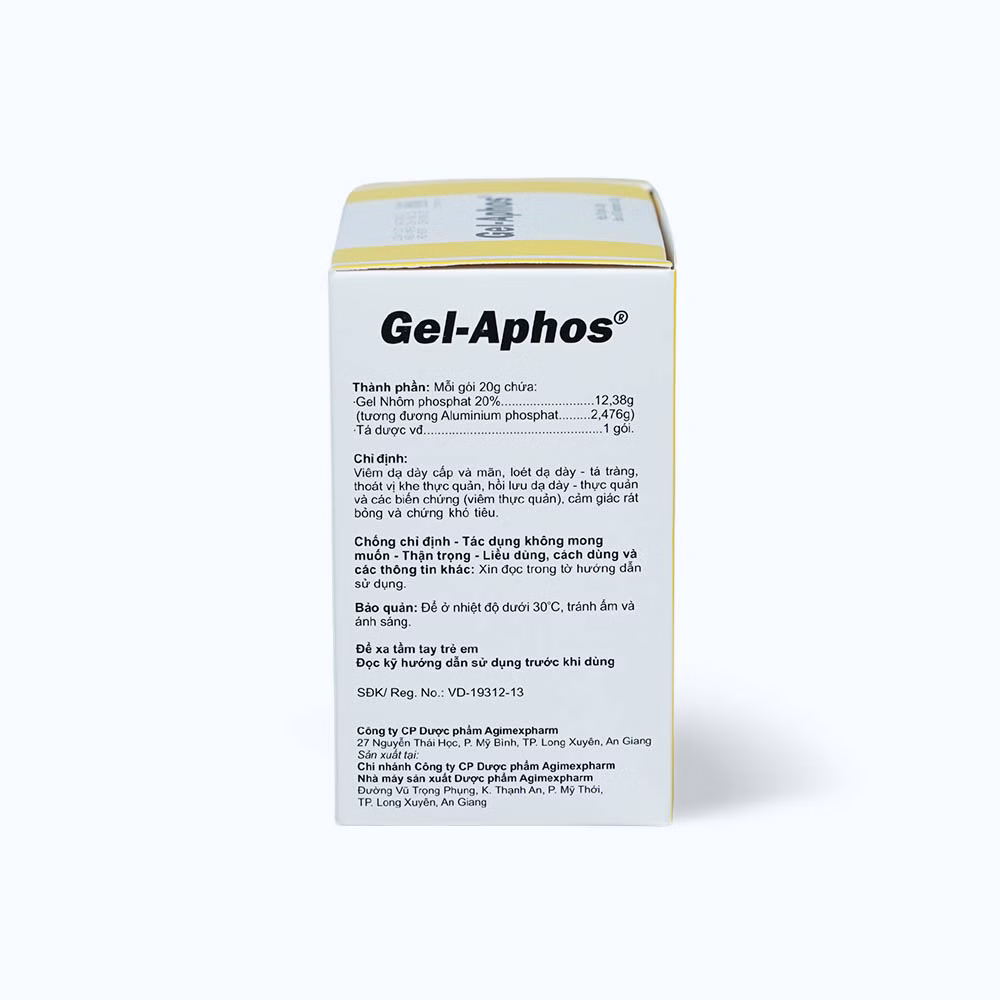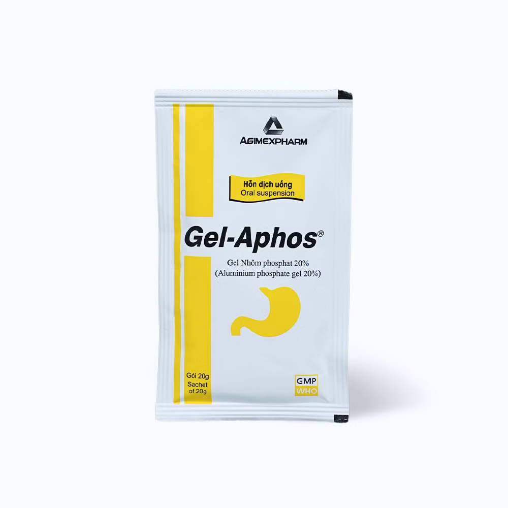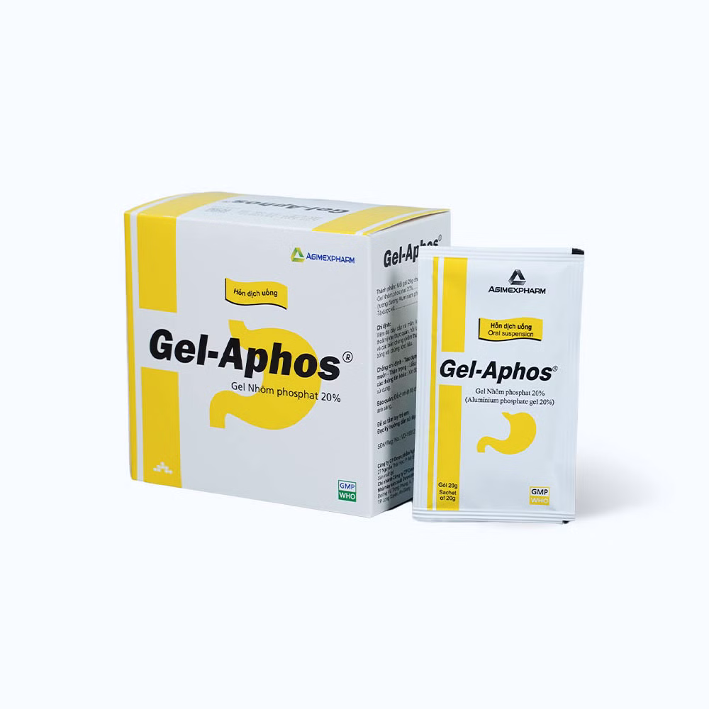 Hỗn dịch uống Gel-Aphos 20% là một loại thuốc dùng để điều trị các vấn đề về dạ dày và đường tiêu hóa, chẳng hạn như viêm loét dạ dày và tá tràng. Thuốc chứa Aluminium phosphate, hoạt động bằng cách trung hòa axit dạ dày và tạo thành một lớp màng bảo vệ trên niêm mạc dạ dày, giúp giảm đau và khó chịu do viêm loét.