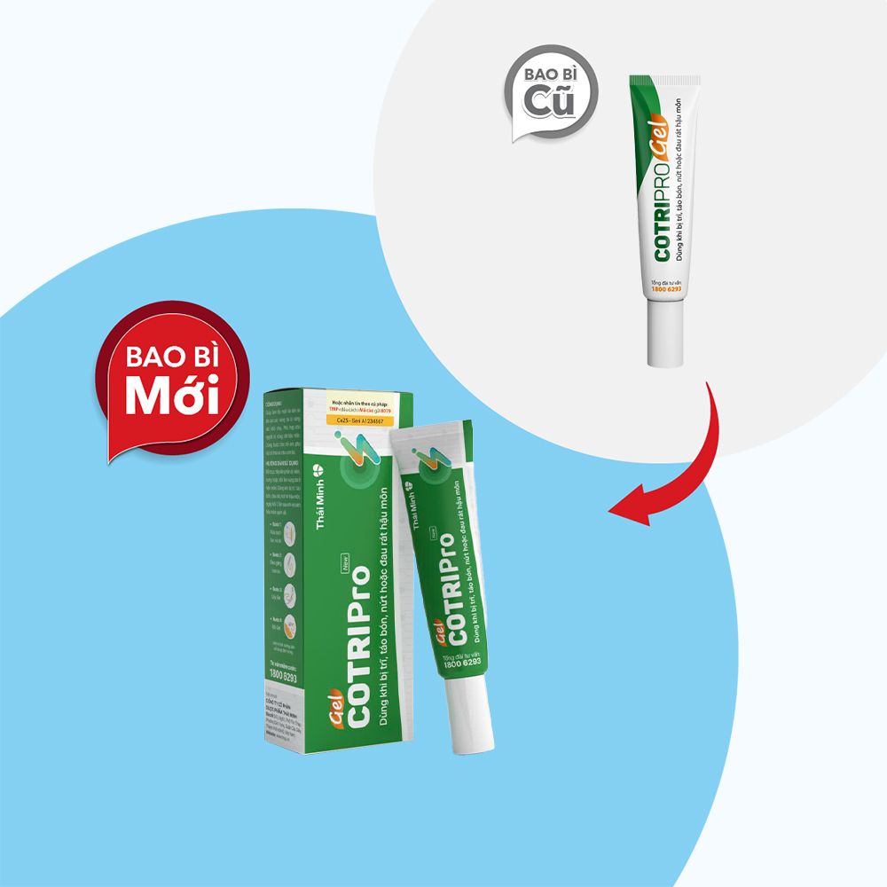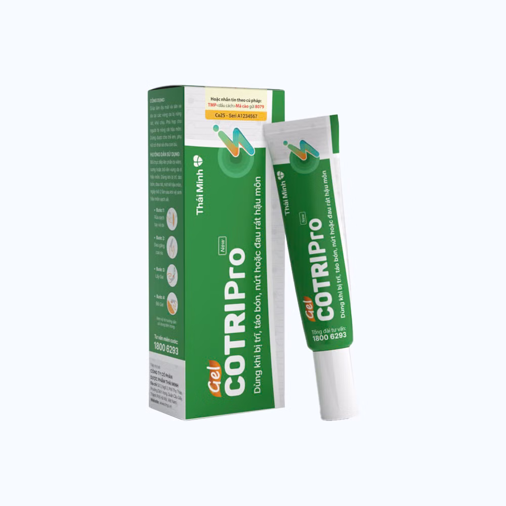 Cotripro Gel là gel bôi đặc hiệu dành riêng cho những người mắc bệnh trĩ. Trong mỗi tuýp gel cotripro đều có chứa chiết xuất từ các loại thảo dược .Với thành phần được nghiên cứu và chuyển giao từ INPC, Viện Hàn Lâm Khoa Học và Công nghệ Việt Nam làm săn se và dịu mát, giúp co trĩ và giảm đau rát nhanh chóng.