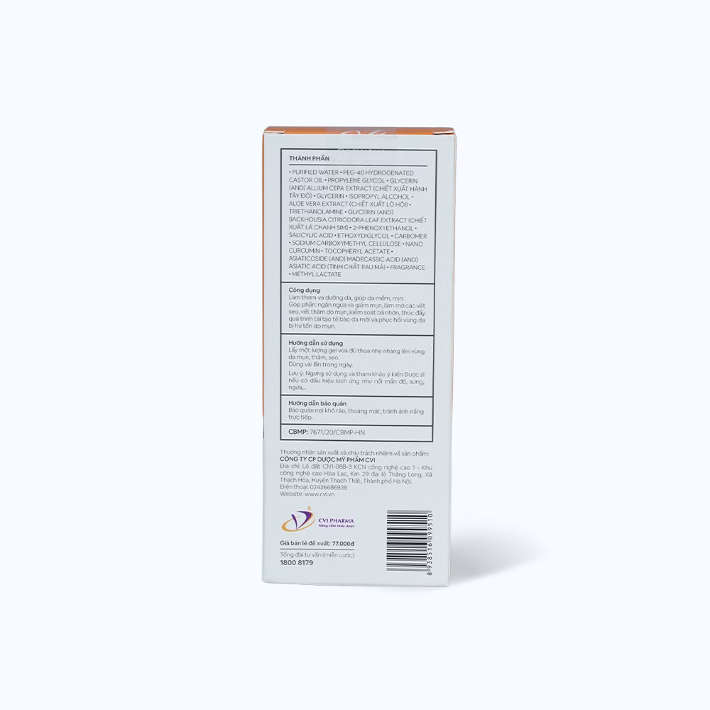 Nơi sản xuất: Công ty cổ phần Dược Mỹ phẩm CVI, Lô đất CN1-08B-3 Khu công nghiệp công nghệ cao 1 – Khu công nghệ cao Hòa Lạc, Km 29 đại lộ Thăng Long, xã Thạch Hòa, huyện Thạch Thất, TP. Hà Nội