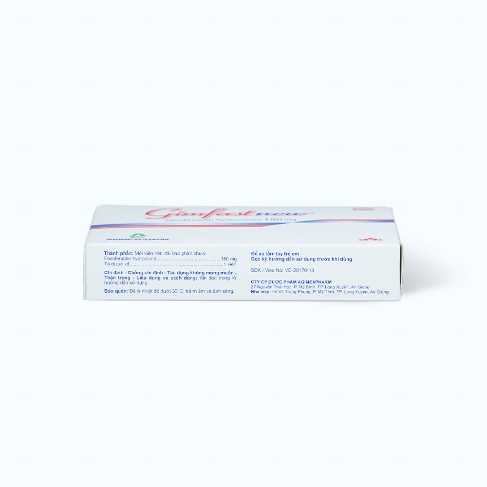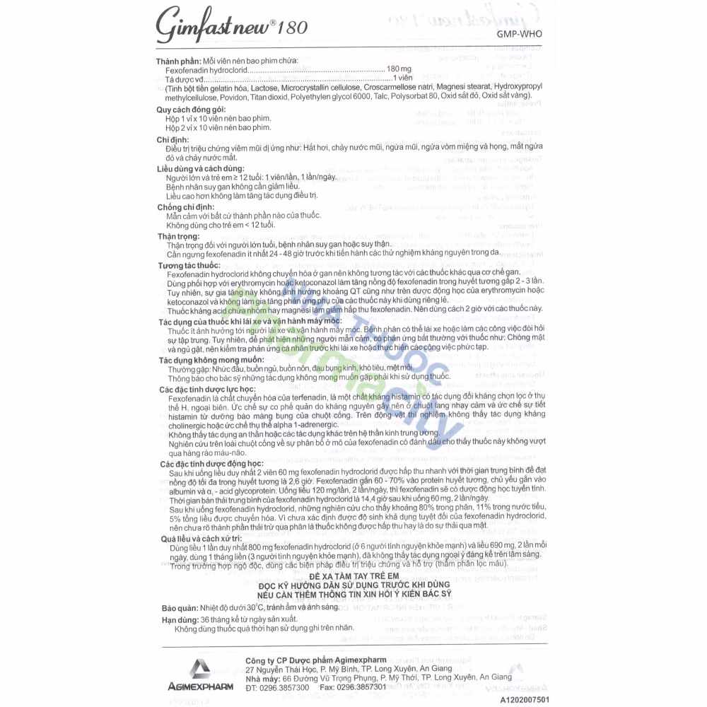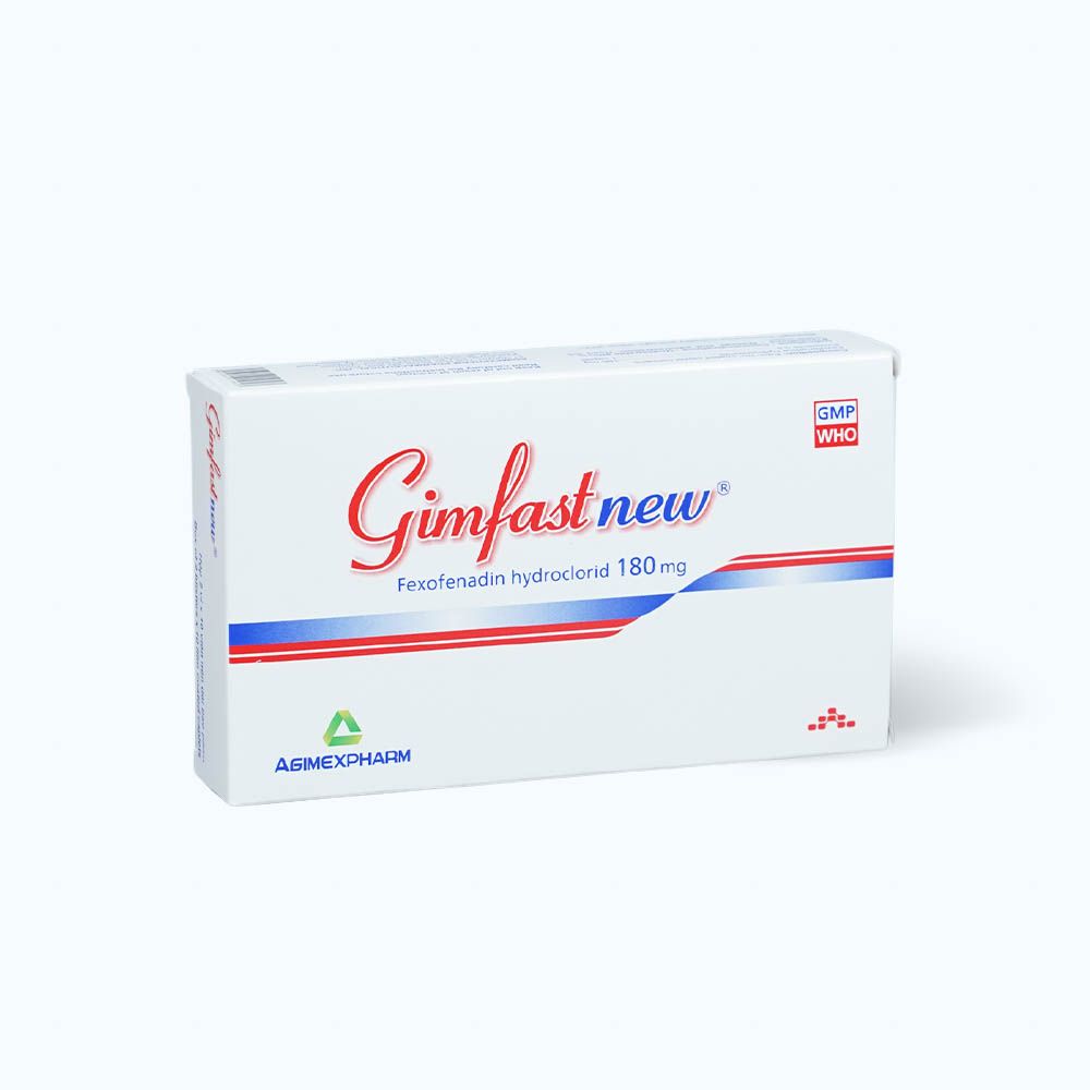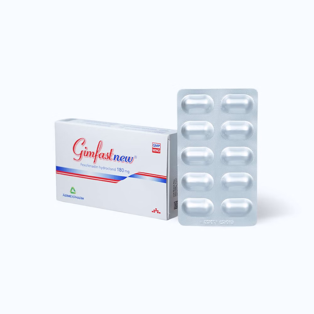 Viên nén Gimfastnew 180mg là thuốc điều trị triệu chứng viêm mũi dị ứng như hắt hơi, chảy nước mũi, ngứa mũi, ngứa vòm miệng và họng, mắt ngứa đỏ và chảy nước mắt.