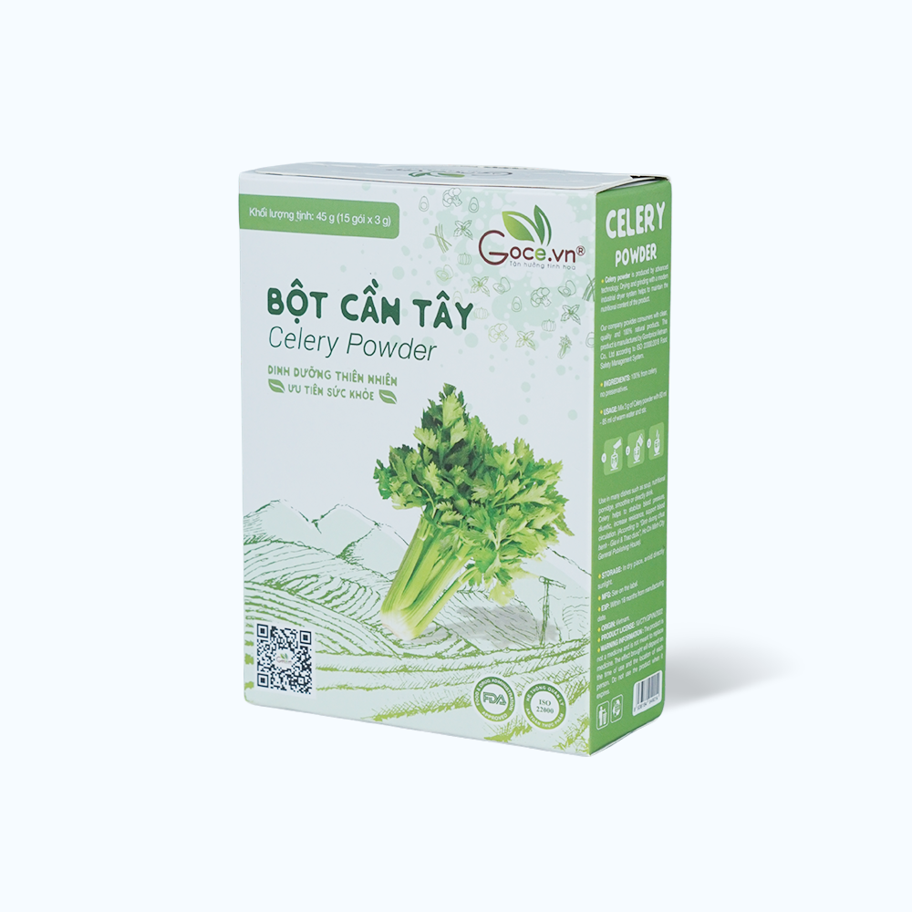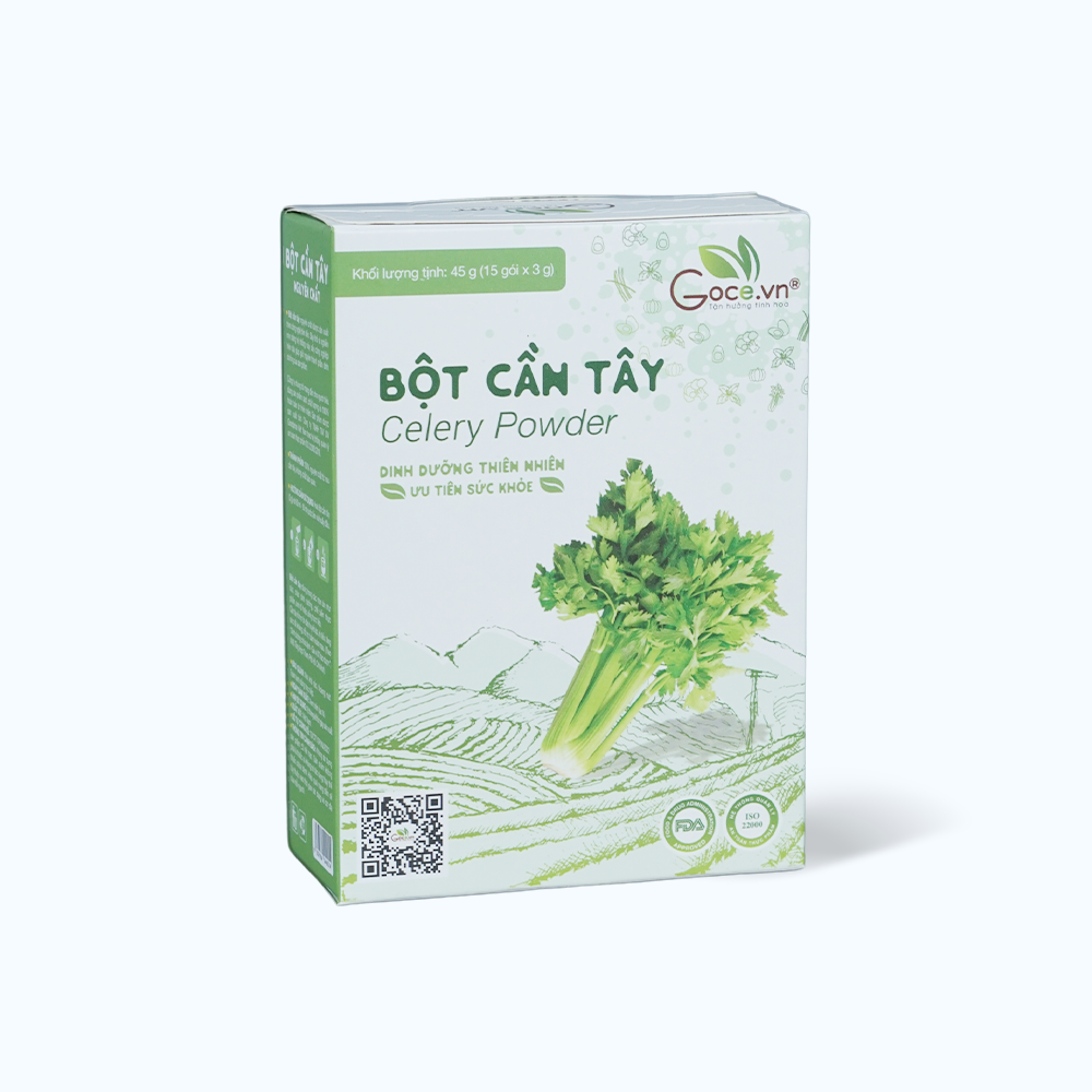 Bột cần tây GOCE là một sản phẩm dinh dưỡng được chiết xuất từ cần tây tươi. Sản phẩm này được đóng gói tiện lợi dưới dạng hộp, mỗi hộp chứa 15 gói nhỏ, mỗi gói có trọng lượng 3g, dễ dàng mang theo và sử dụng.