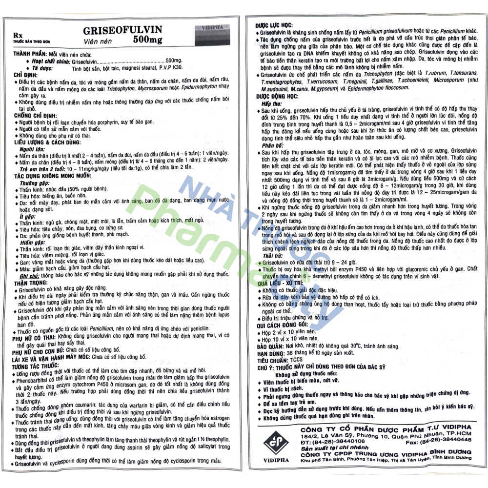 Công dụng của Viên nén Griseofulvin 500mg Vidipha