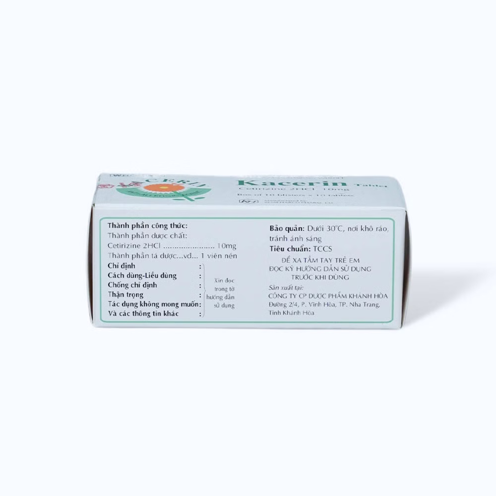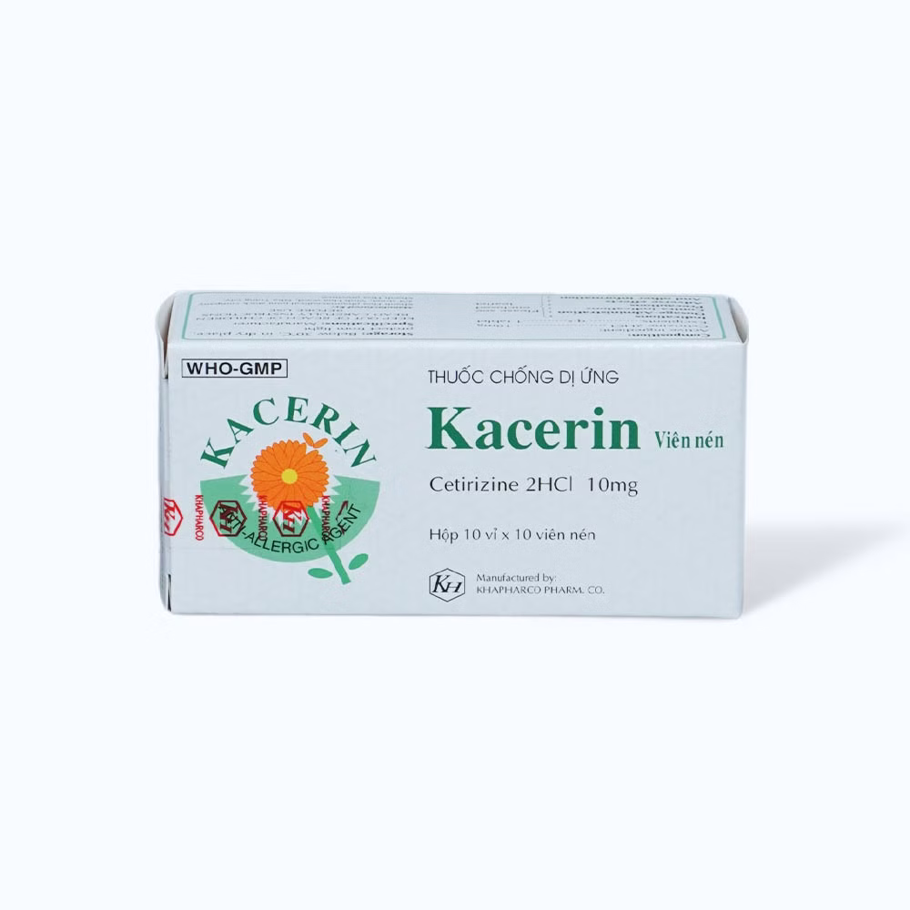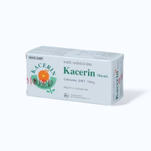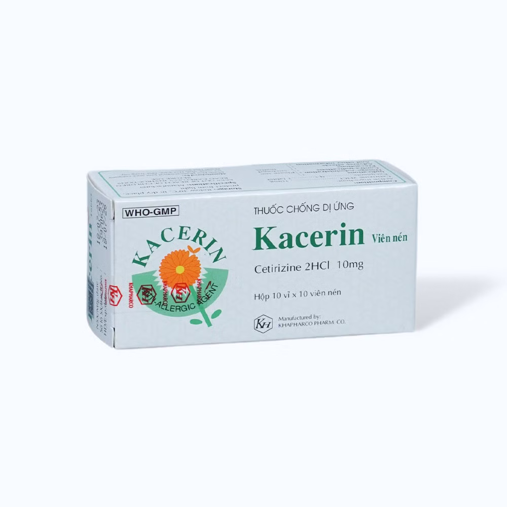 Kacerin là sản phẩm của Công ty Cổ phần Dược phẩm Khánh Hoà có thành phần chính Cetirizin dihydroclorid dùng điều trị triệu chứng viêm mũi dị ứng dai dẳng, viêm mũi dị ứng theo mùa. Điều trị triệu chứng mày đay mạn tính vô căn ở người lớn và trẻ em trên 12 tuổi, viêm kết mạc dị ứng.