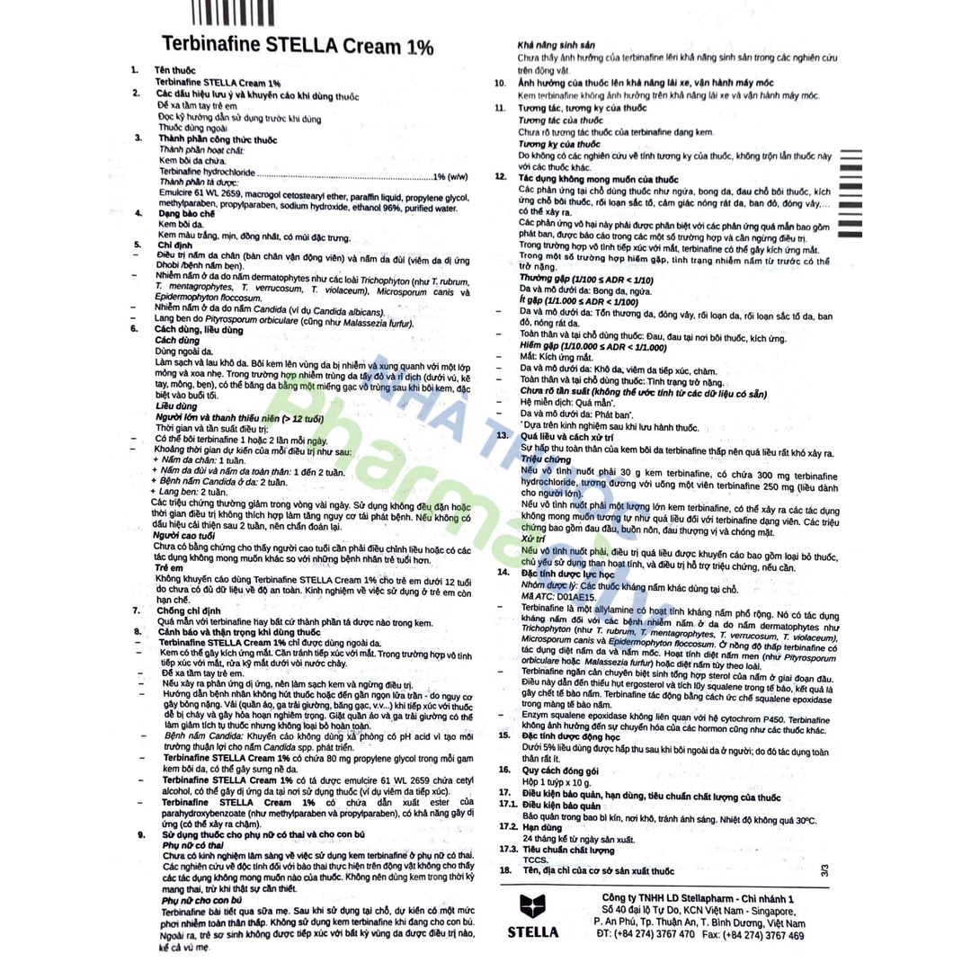 Terbinafin Stella Cream 1% dùng thoa ngoài da 1 hoặc 2 lần mỗi ngày.