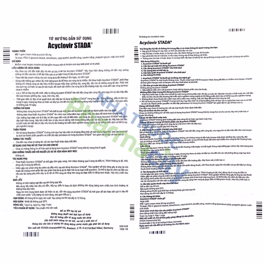 Thuốc Acyclovir Stada của Công ty LD TNHH Stada – Việt Nam. Thuốc có thành phần chính là Acyclovir, đây là loại thuốc có tác dụng điều trị những vùng da nhiễm virus Herpes simplex, bao gồm Herpes môi và Herpes sinh dục khởi phát hoặc tái phát. Với các hoạt chất và tá dược có trong thuốc, sẽ giúp làm lành các vùng da bị tổn thương bởi vi khuẩn gây bệnh một cách nhanh chóng và hiệu quả chỉ sau thời gian sử dụng.