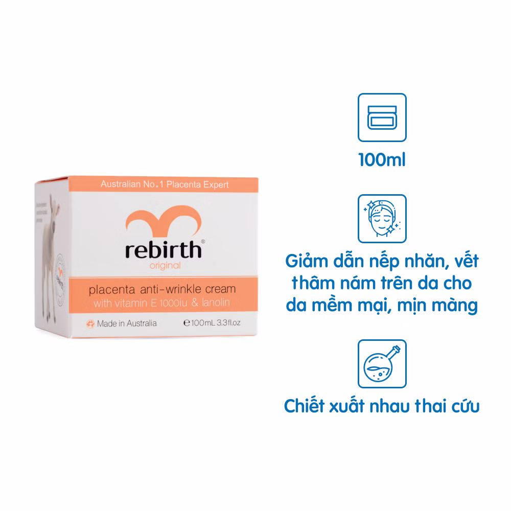 - Kem Dưỡng Trắng Và Giảm Nếp Nhăn Rebirth 100ml với tinh chất nhau thai cừu đậm đặc từ thiên nhiên giàu dưỡng chất với các phân tử nhỏ dễ dàng thẩm thấu qua da, có công dụng kích thích sự tăng trưởng của các tế bào mới, đồng thời làm giảm các nếp nhăn giúp da săn chắc mịn màng