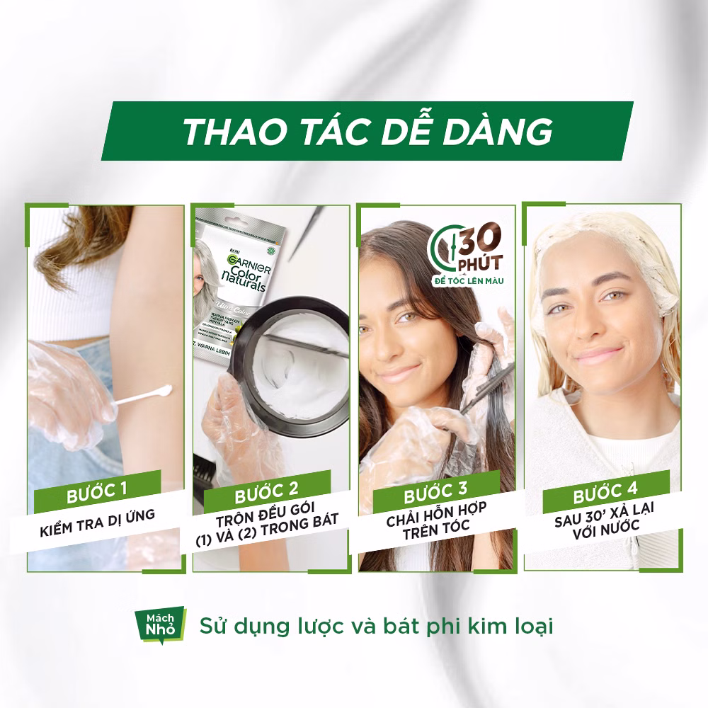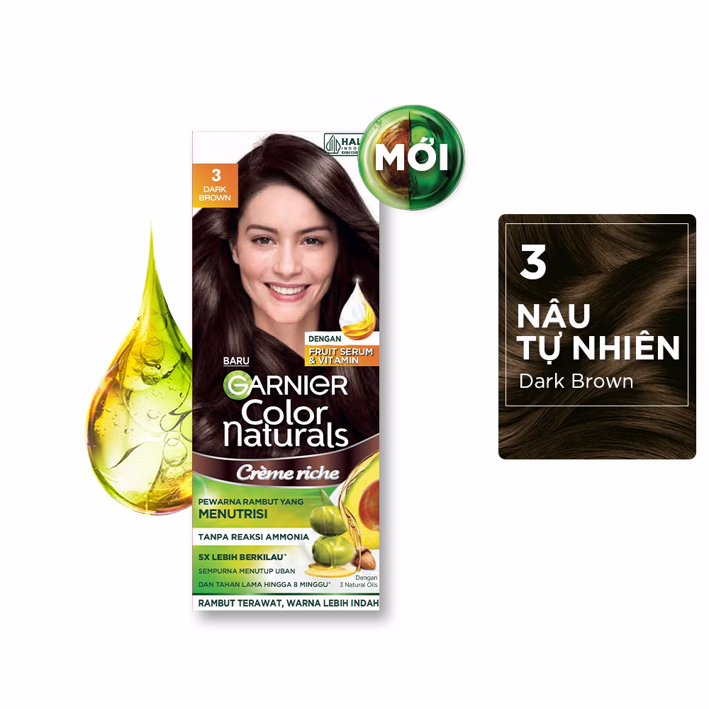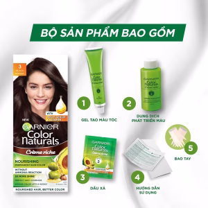 Kem Nhuộm Tóc Garnier Color Naturals Crème Riche mang đến mái tóc nhuộm chuẩn màu rực rỡ. Công nghệ Color Lock kết hợp 3 loại dầu tự nhiên (dầu ô liu, dầu quả bơ, dầu hạt hạnh nhân) duy trì màu tóc hiệu quả và dưỡng tóc mềm mượt.