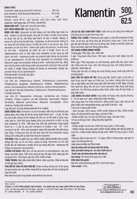 Klamentin 500/62.5 của Công ty Cổ phần Dược Hậu Giang, có thành phần chính amoxicillin và acid clavulanic.