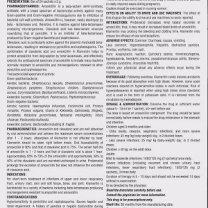 Đây là thuốc dùng để điều trị ngắn hạn các nhiễm khuẩn đường hô hấp trên và dưới, đường tiết niệu, da và mô mềm, xương và khớp. Klamentin có tính diệt khuẩn đối với nhiều loại vi khuẩn kể cả các dòng tiết beta – lactamase đề kháng với ampicilin và amoxicilin.