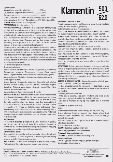 - Sự kết hợp acid clavulanic và amoxicilin trong Klamentin 500/62.5 giúp cho amoxicilin không bị beta – lactamase phá hủy, đồng thời mở rộng thêm phổ kháng khuẩn của amoxicillin một cách hiệu quả đối với nhiều vi khuẩn thông thường đã kháng lại amoxicillin, kháng các penicilin khác và các cephalosporin.