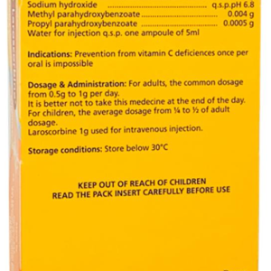 Thành phần củaLaroscorbine 1g/5ml – Bayer: Ascorbic acid (Vitamin C) với hàm lượng là 1g/5ml cùng 1 số tá dược và phụ liệu khác hàm lượng vừa đủ 1 ống tiêm.