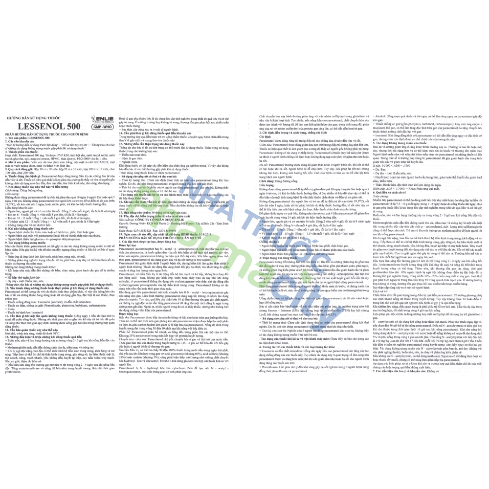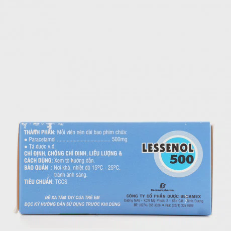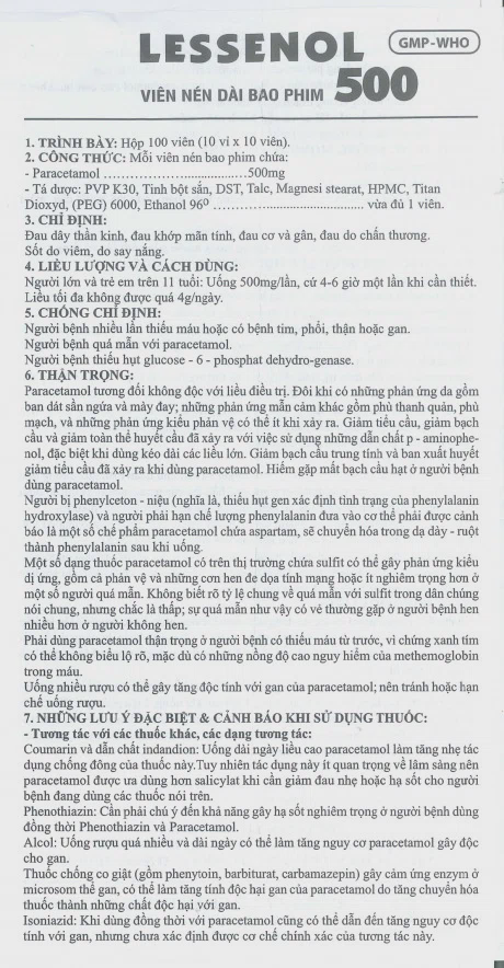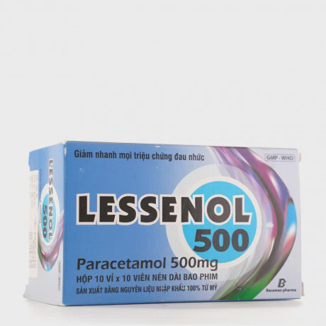 Viên nén Lessenol 500mglà một loại thuốc giảm đau, hạ sốt phổ biến với thành phần chính là Paracetamol 500mg. Thuốc được sử dụng trong các trường hợp nhằm giảm đau từ nhẹ đến trung bình và sốt do mọi nguyên nhân.