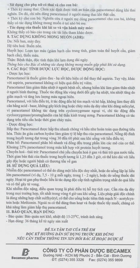 - Paracetamol không độc với liều điều trị. Đôi khi có những phản ứng da gồm ban dát sần ngứa và mày đay; những phản ứng mẫn cảm khác gồm phù thanh quản, phù mạch và những phản ứng kiểu phản vệ có thể ít khi xảy ra. Giảm tiểu cầu, giảm bạch cầu và giảm toàn thể huyết cầu đã xảy ra.