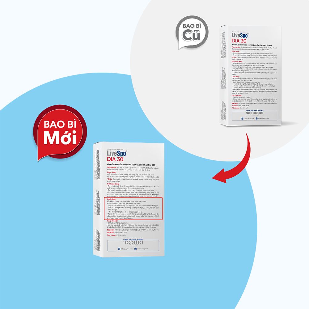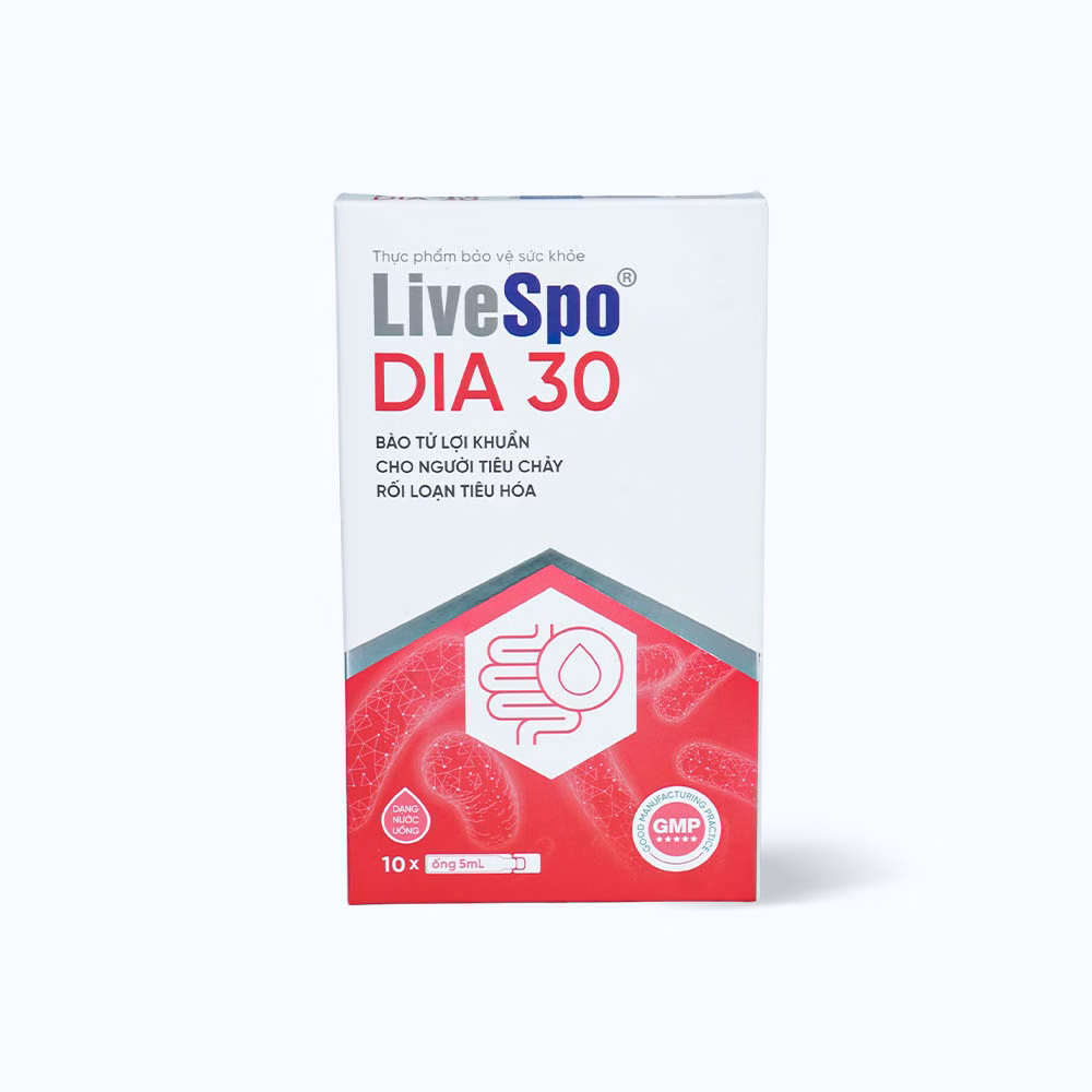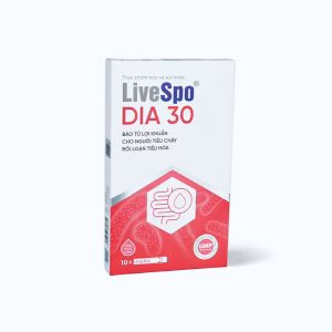 LiveSpo DIA 30 hỗ trợ giảm các triệu chứng tiêu chảy cấp tính, rối loạn tiêu hoá. Bổ sung lợi khuẩn ở dạng bào tử giúp hỗ trợ cân bằng hệ vi sinh đường ruột.