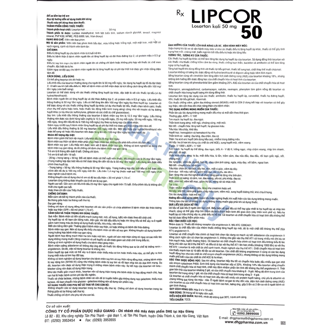 Lipcor 50mg là một loại thuốc được sử dụng để điều trị tăng huyết áp, giúp kiểm soát huyết áp và ngăn ngừa các biến chứng nghiêm trọng như đột quỵ, nhồi máu cơ tim và suy thận. Thuốc chứa hoạt chất Losartan kali, thuộc nhóm thuốc chẹn thụ thể angiotensin II (ARB), hoạt động bằng cách giãn nở các mạch máu, giúp máu lưu thông dễ dàng hơn. Ngoài ra, Lipcor 50mg còn được sử dụng để điều trị bệnh thận ở những bệnh nhân đái tháo đường týp 2 và suy tim mạn tính ở những người không thể dùng thuốc ức chế men chuyển. Được sản xuất bởi Dược Hậu Giang, Lipcor 50mg là một lựa chọn tin cậy trong việc quản lý và điều trị tăng huyết áp.