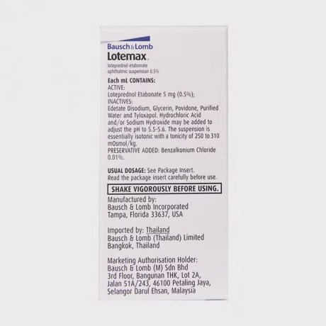 – Thông tin cho bệnh nhân: Sản phẩm đóng gói vô trùng. Khuyên bệnh nhân không để đầu nhỏ giọt chạm vào bất kỳ bề mặt nào vì có thể gây tạp nhiễm hỗn dịch. Nếu thấy mắt đau, đỏ, ngứa hoặc tình trạng viêm trở nên nặng hơn, người bệnh cần hỏi ý kiến bác sĩ. Cũng giống với các chế phẩm thuốc mắt có benzalkonium clorid khác, bệnh nhân không nên đeo kính áp tròng mềm trong suốt thời gian điều trị với LOTEMAX.