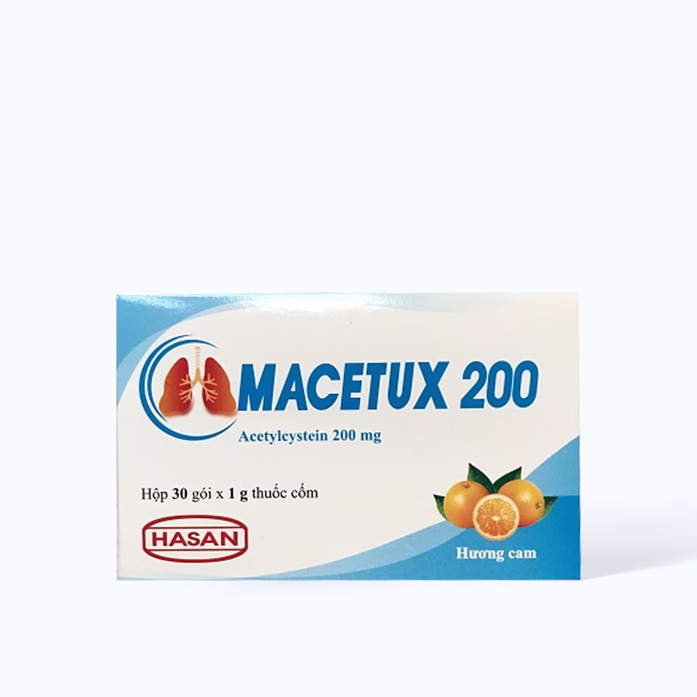 Thuốc cốm macetux acetylcystein 200mg hasan (h/30g/1gr) Macetux 200 chứa acetylcystein với hàm lượng 200mg, là loại thuốc tiêu đi các chất nhầy. Thuốc được dùng để điều trị các rối loạn tiết dịch phế quản, đặc biệt trong các rối loạn phế quản cấp tính, như viêm phế quản cấp và đợt cấp của bệnh phổi mạn tính