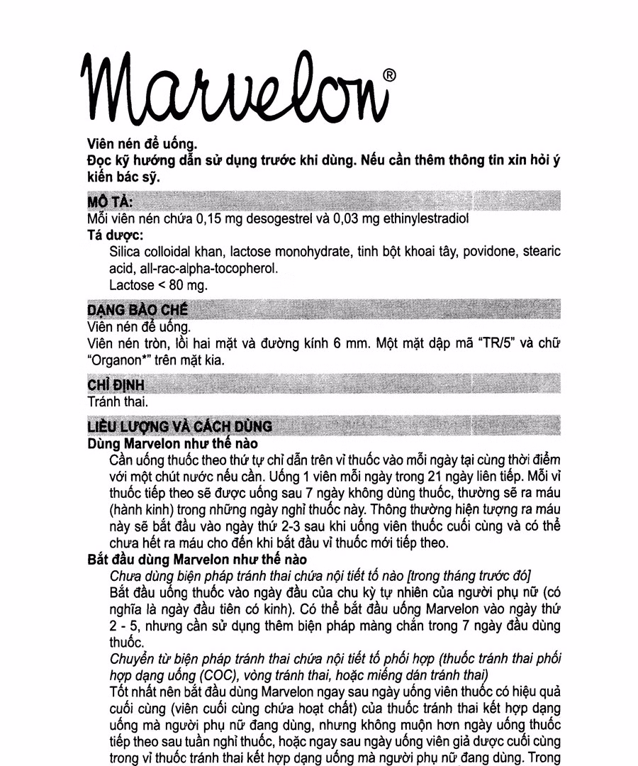 Chuyển từ biện pháp tránh thai khác (thuốc viên tránh thai phối hợp (TVTTPH) khác, vòng tránh thai hoặc miếng dán tránh thai) sang dùng Marvelon: Tốt nhất nên bắt đầu dùng Marvelon ngay sau khi uống viên thuốc mà người phụ nữ đang dùng. Trong trường hợp người phụ nữ đang dùng vòng tránh thai hoặc miếng dán tránh thai, tốt nhất nên bắt đầu dùng Marvelon ngay sau ngày tháo vòng tránh thai hoặc miếng dán tránh thai. Sau khi sảy thai 3 tháng đầu có thể dùng Marvelon ngay lập tức mà không cần dùng biện pháp tránh thai nào.
