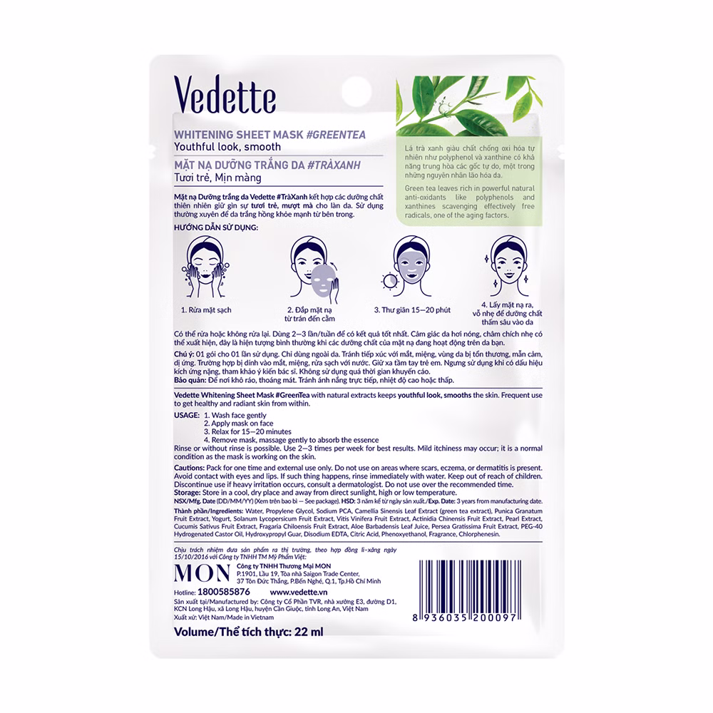 Thành Phần Mặt nạ giấy dưỡng trắng da trà xanh Vedette