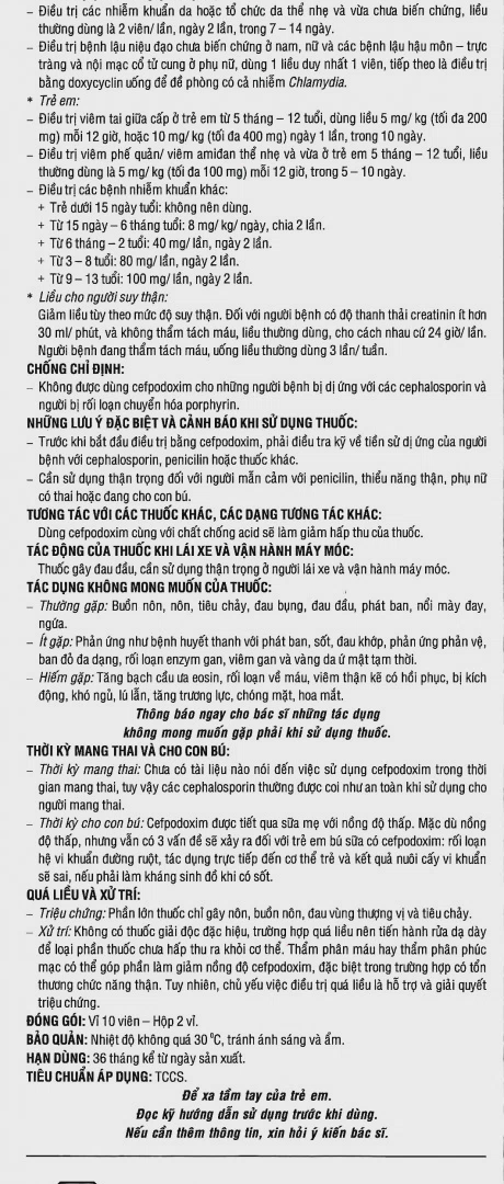 – Liều duy nhất 200 mg cefpodoxim được dùng điều trị bệnh lậu cấp, chưa biến chứng, ở nội mạc nội cổ tử cung hoặc hậu môn – trực tràng của phụ nữ và bệnh lậu ở niệu đạo cảu phụ nữ và nam giới, do các chủng có hoặc không tại penicilinase.