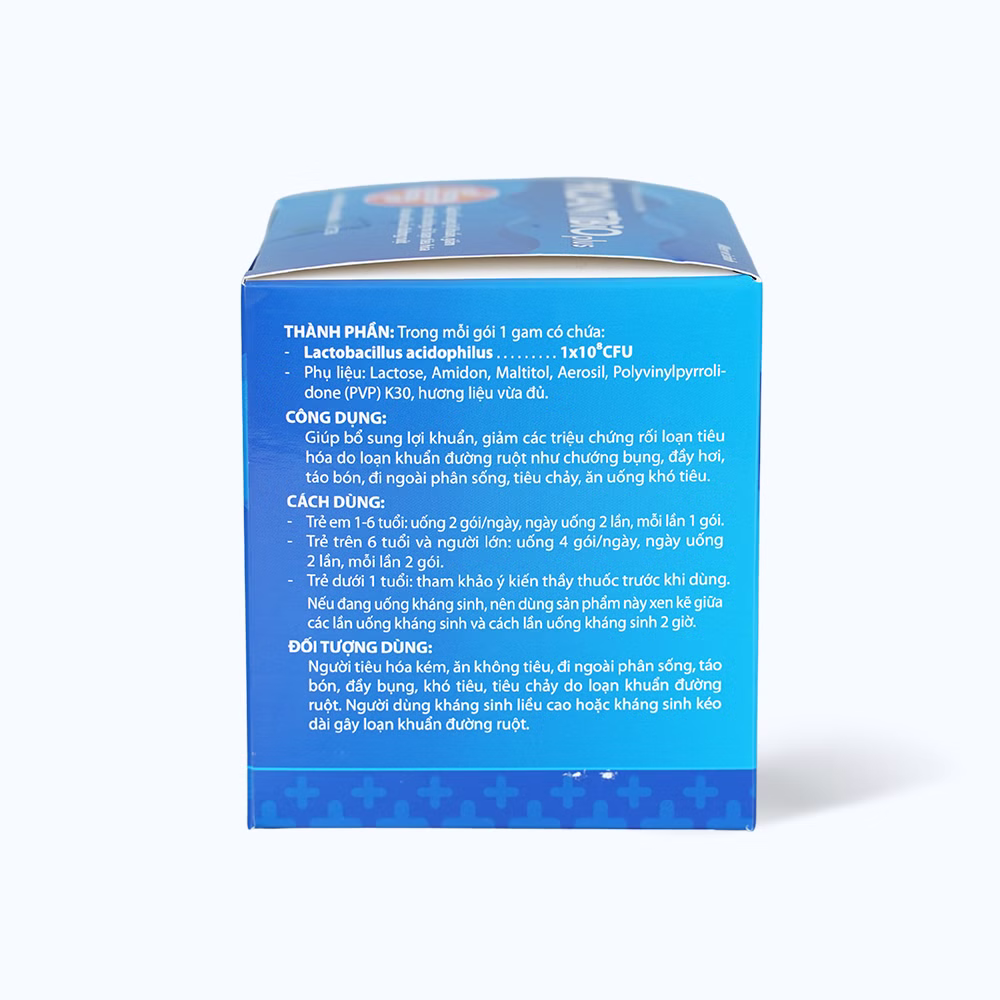 Giúp bổ sung lợi khuẩn, giảm các triệu chứng rối loạn tiêu hóa do loạn khuẩn đường ruột như: chướng bụng, đầy hơi, táo bón, đi ngoài phân sống, tiêu chảy, ăn uống khó tiêu.