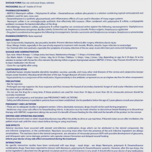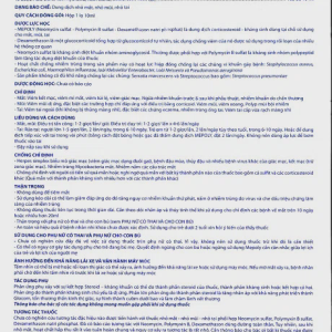 - Hoạt chất: Neomycin (dưới dạng Neomycin sulfat) 35mg, Polymycin B sulfat 100.000IU, Dexamethason (dưới dạng Dexamethason natri phosphat) 10mg