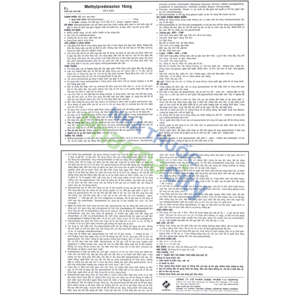 - Hoạt chất chính: Methylprednisolon 16mg.