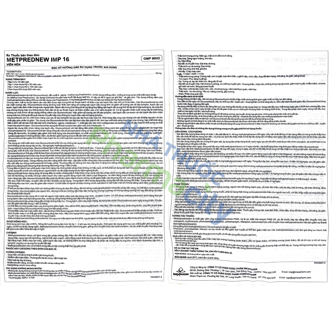 Metprednew IMP 16 là một loại thuốc corticosteroid chứa Methylprednisolone. Thuốc được sử dụng để điều trị các tình trạng viêm và dị ứng như viêm khớp, các bệnh tự miễn, và dị ứng nặng. Methylprednisolone giúp giảm viêm, sưng, và các phản ứng dị ứng bằng cách ức chế hệ miễn dịch.