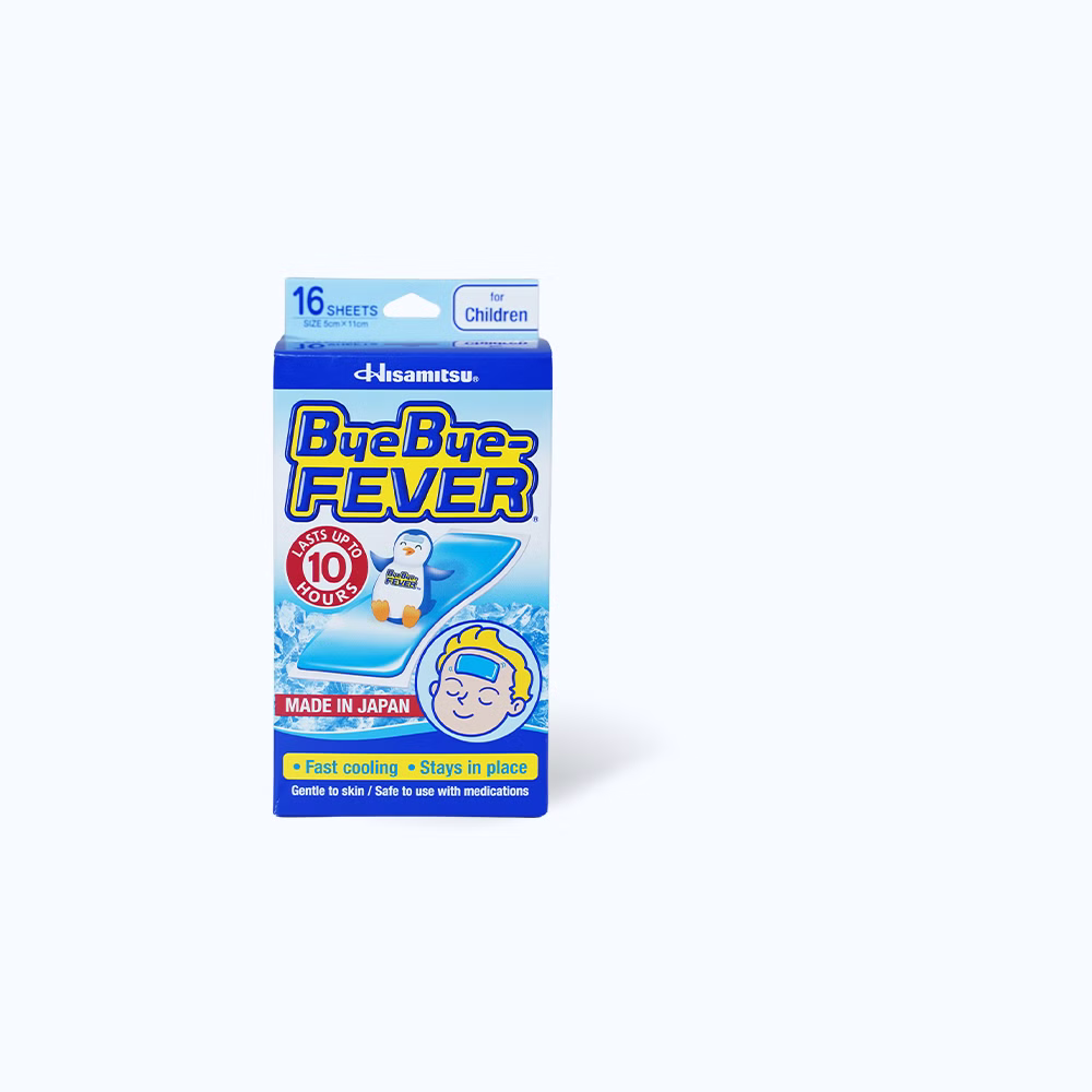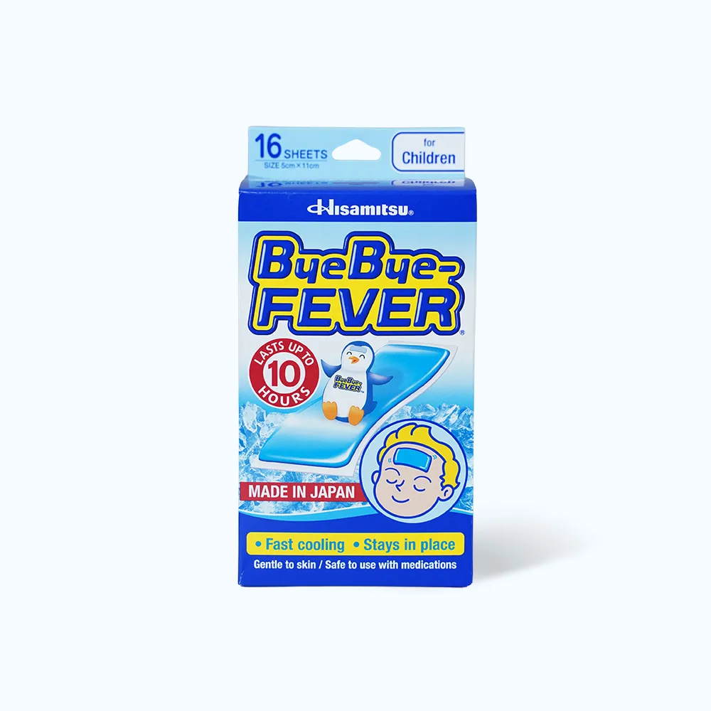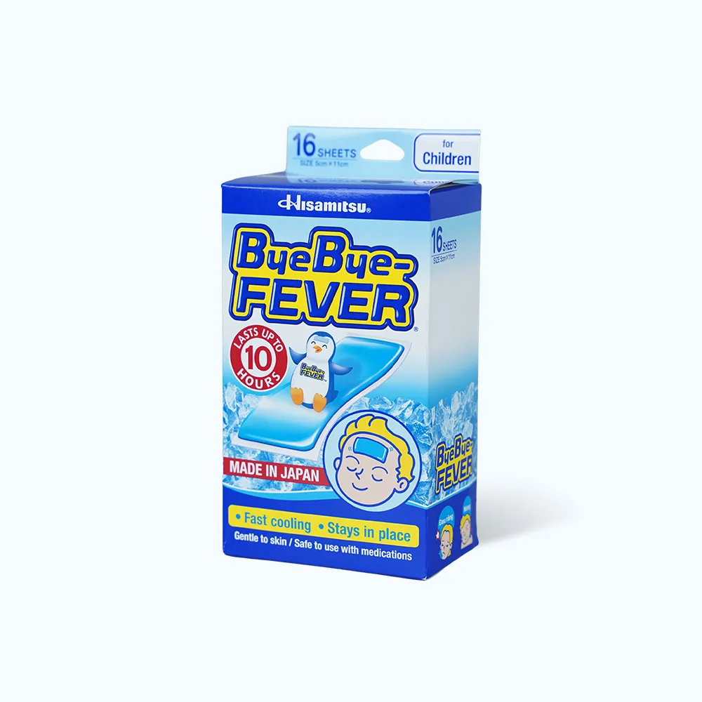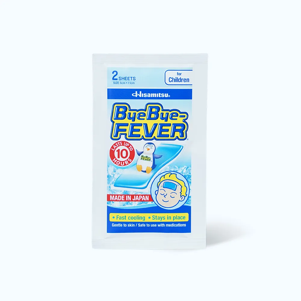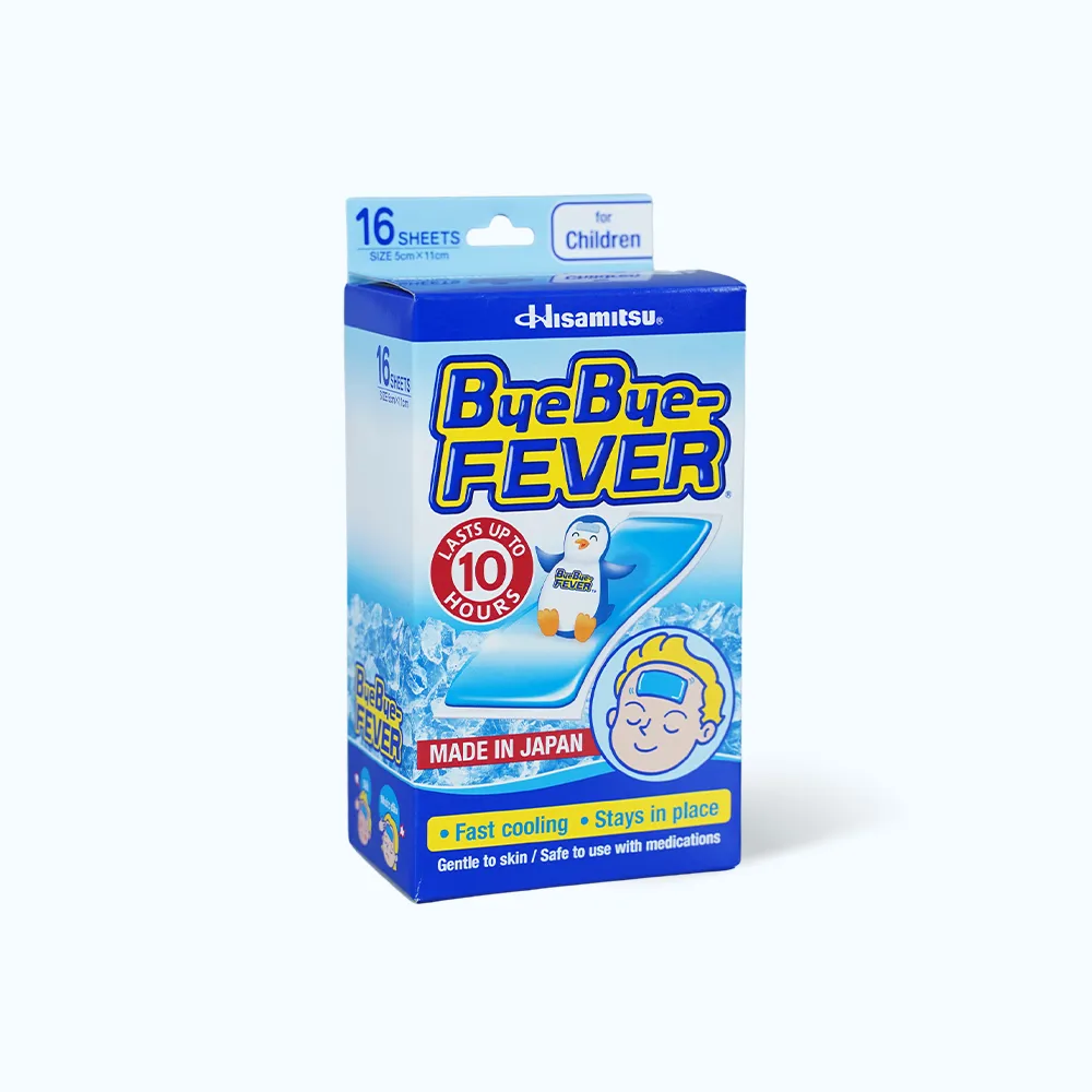 Miếng dán giảm sốt, hạ nhiệt nhanh Hisamitsu Bye Bye Fever với ưu điểm giảm sốt nhanh chóng, kéo dài đến 10 giờ và tuyệt đối an toàn khi sử dụng với các loại thuốc khác mang lại cảm giác thoải mái sau khi sử dụng. Sản phẩm này có thể sử dụng được cho trẻ sơ sinh và trong các trường hợp đau răng, muốn tăng sự tập trung, hoặc muốn tỉnh táo hơn trong công việc cho cả phụ huynh và cho con nhỏ.