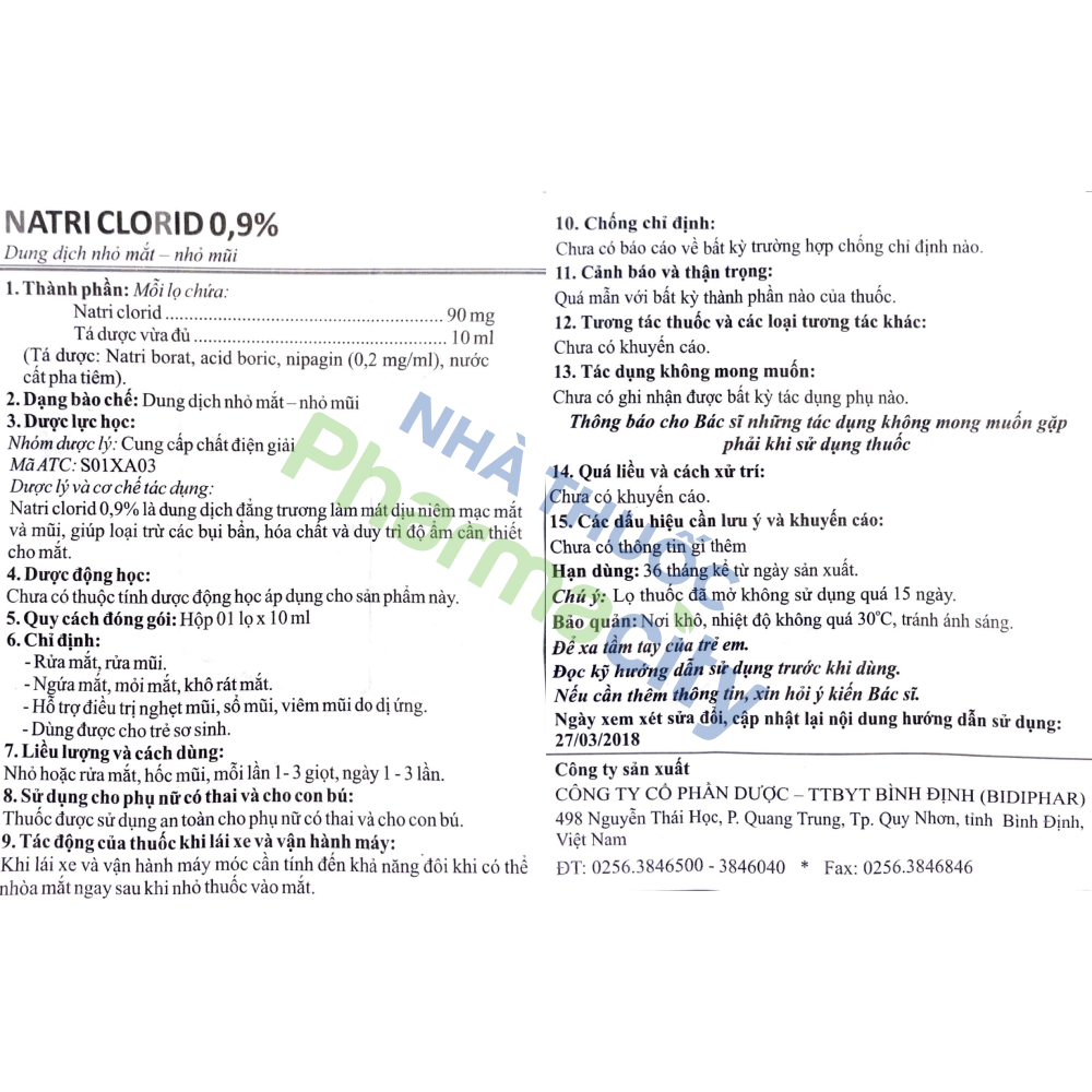 Natri clorid 0,9% là dung dịch đẳng trương được dùng rửa mắt và được dùng nhỏ mũi để giảm những triệu chứng như nghẹt mũi, chảy mũi, viêm mũi do dị ứng.