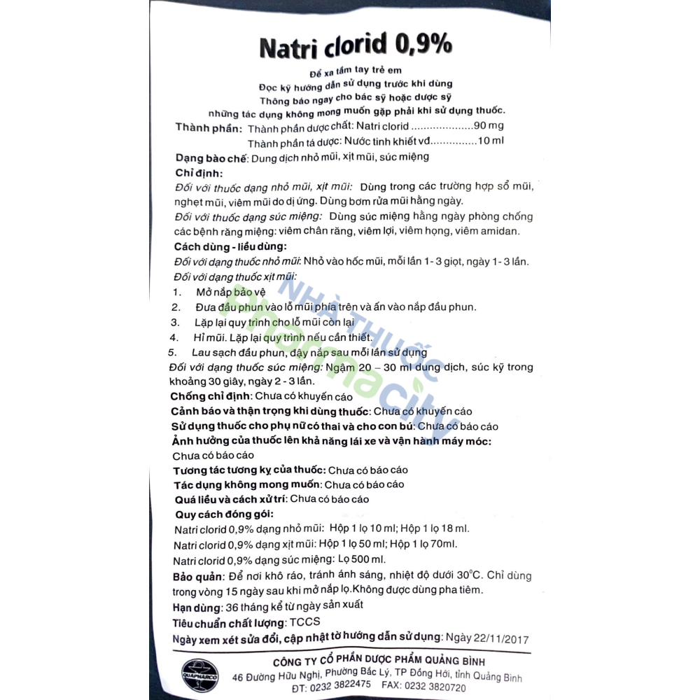 Thành phần Dung dịch nhỏ mũi Natri clorid 0,9% Quảng Bình