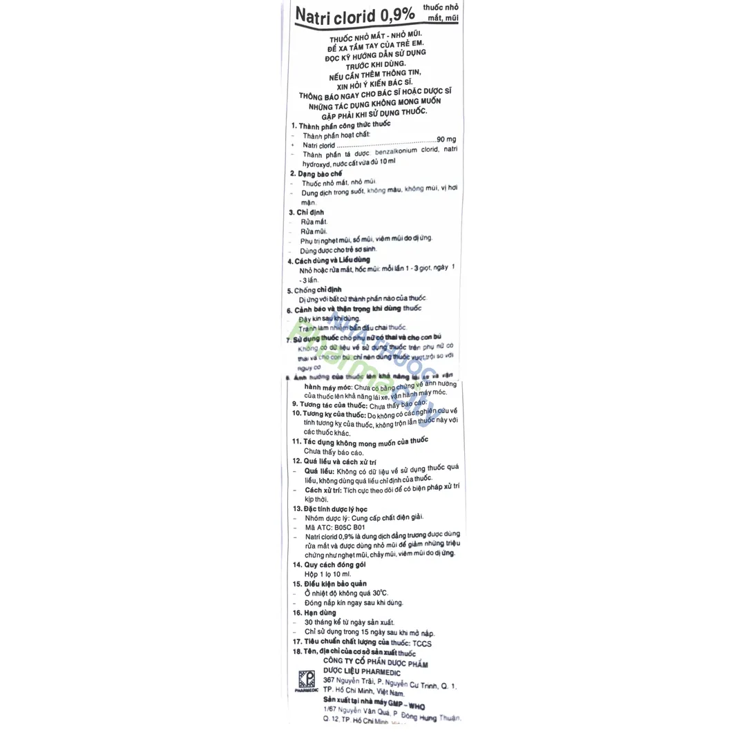 Dung dịch Natri Clorid 0,9% dùng nhỏ hoặc rửa mắt, hốc mũi.
