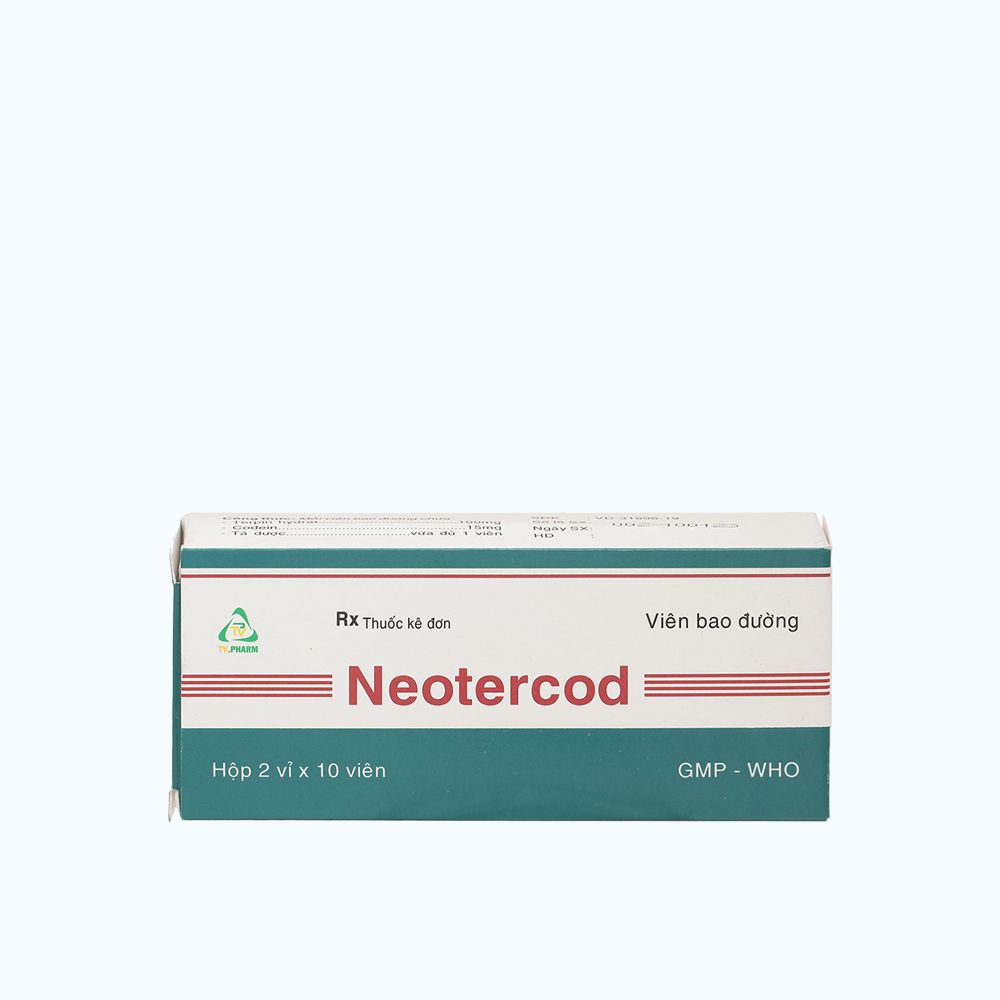 Thuốc Neotercod là sản phẩm của công ty TV.Pharm chứa hoạt chất Codein camfosulfonat; Sulfoguaiacol; Cao mềm Grindelia 25mg;100mg; 20mg điều trị triệu chứng ho khan, ho do kích ứng (2 vỉ x 10 viên)