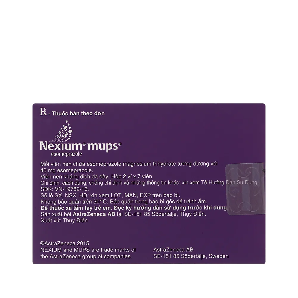 Thuốc Nexium Mups 40mg là viên nén bao phim kháng dịch dạ dày là sản phẩm của AstraZeneca (Thuỵ Điển) có thành phần hoạt chất chính là Esomeprazole và được chỉ định trong điều trị các bệnh lý như trào ngược dạ dày – thực quản (GERD), loét dạ dày tá tràng và hội chứng Zollinger Ellison.