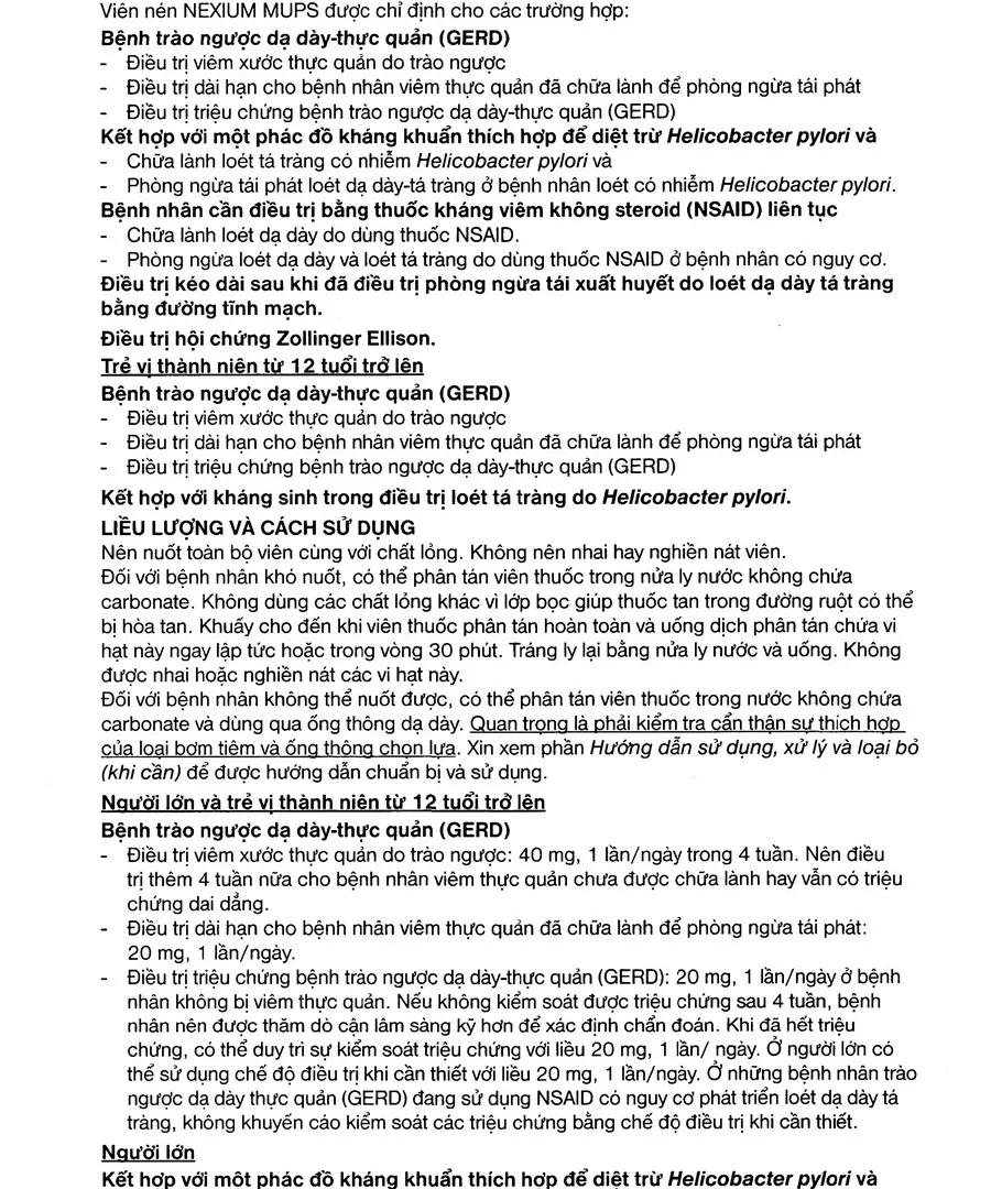 - Phòng ngừa tái phát loét dạ dày – tá tràng ở bệnh nhân loét có nhiễm Helicobacter pylori: NEXIUM MUPS 20mg, amoxicillin 1g và clarithromycin 500mg, tất cả được dùng 2 lần/ngày trong 7 ngày.