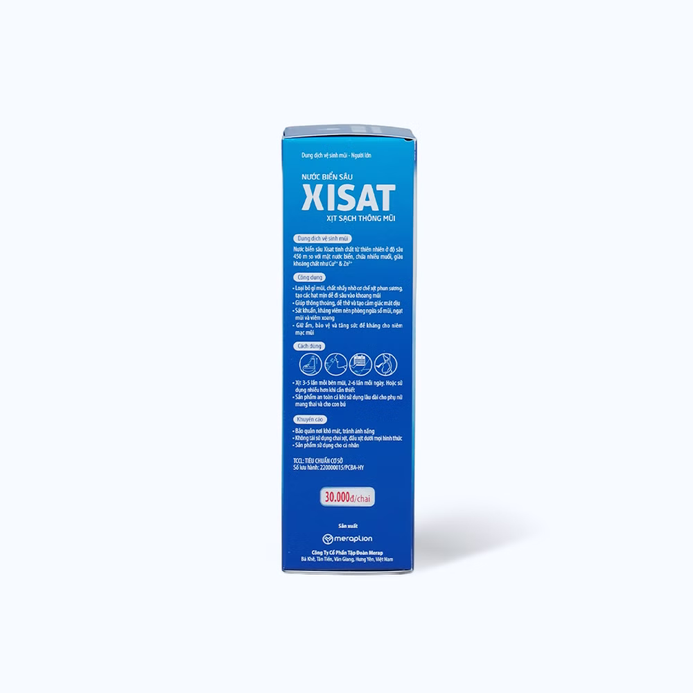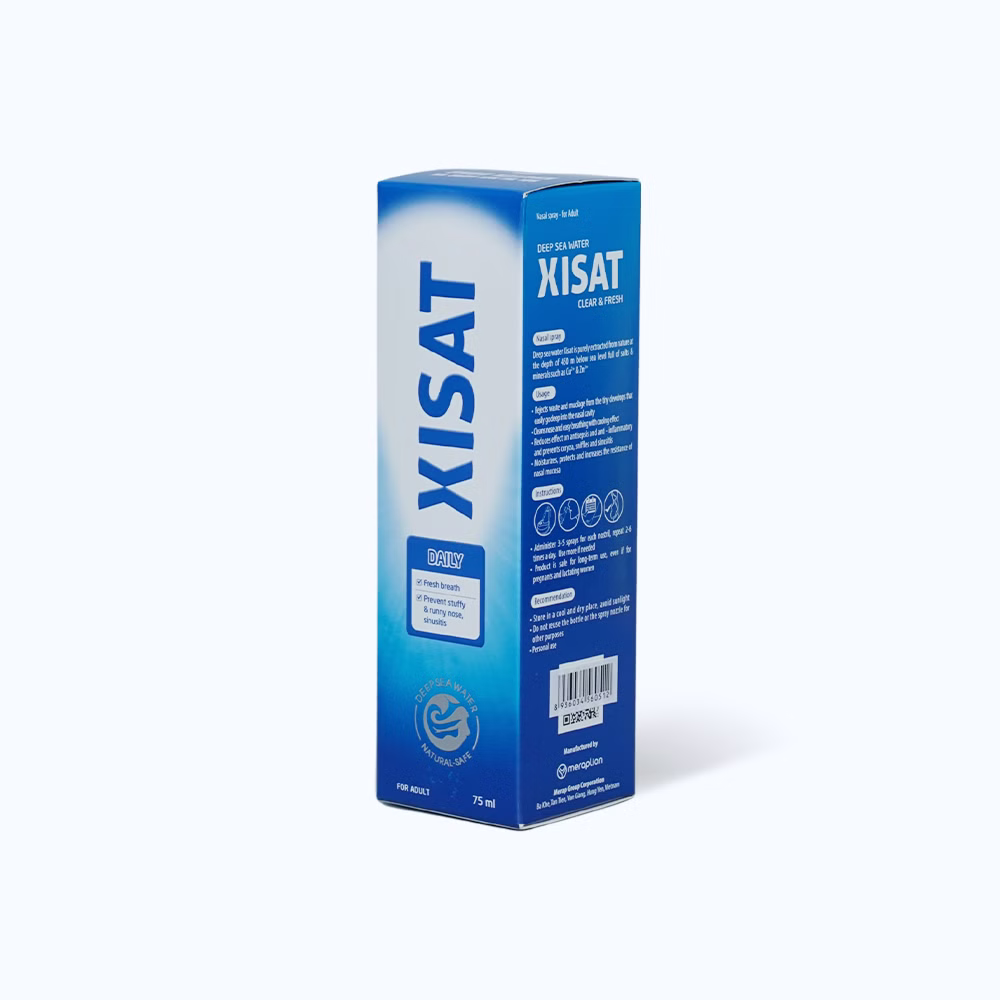 Chai xịt mũi Xisat người lớn với thành phần nước biển sâu thiên nhiên tinh khiết từ độ sâu 450m, giàu muối và khoáng chất như Cu2+, Zn2+… có tính kháng khuẩn, kháng viêm, săn se niêm mạc. Sản phẩm dạng phun sương siêu nhỏ, dễ dàng đi sâu vào khoang mũi giúp làm sạch dịch nhầy và các tác nhân gây bệnh.