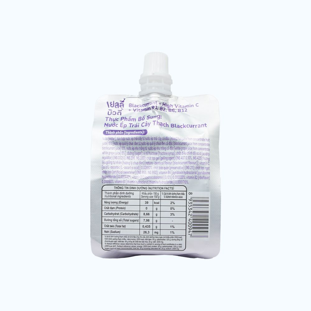 Nước; hỗn hợp nước ép trái cây từ nước ép trái cây cô đặc 15% (nước ép nho trắng từ nước quả lý chua đen từ nước ép quả lý chua đen cô đặc 10%, nước ép nho trắng từ nước ép nho trắng cô đặc 5%);đường; xi rô fructose; chất điều chỉnh độ acid (INS 332(ii), INS 296, INS 330); chất tạo gel (INS 407) 0,10%; chất ổn định (INS 425); hương liệu giống tự nhiên (hương lý chua đen); chất bảo quản (INS 211); vitamin C (acid L-ascorbic) 0,02850%; chất tạo ngọt nhân tạo (INS 955, INS 950); vitamin B6 (pyridoxine hydrochloride) 0,000440%; vitaminn B12 (cyanocobalamin) 0.000320%; vitamin B2 (riboflavin) 0,000180%, vitamin B1 (thiamine hydrocloride) 0,0001710%