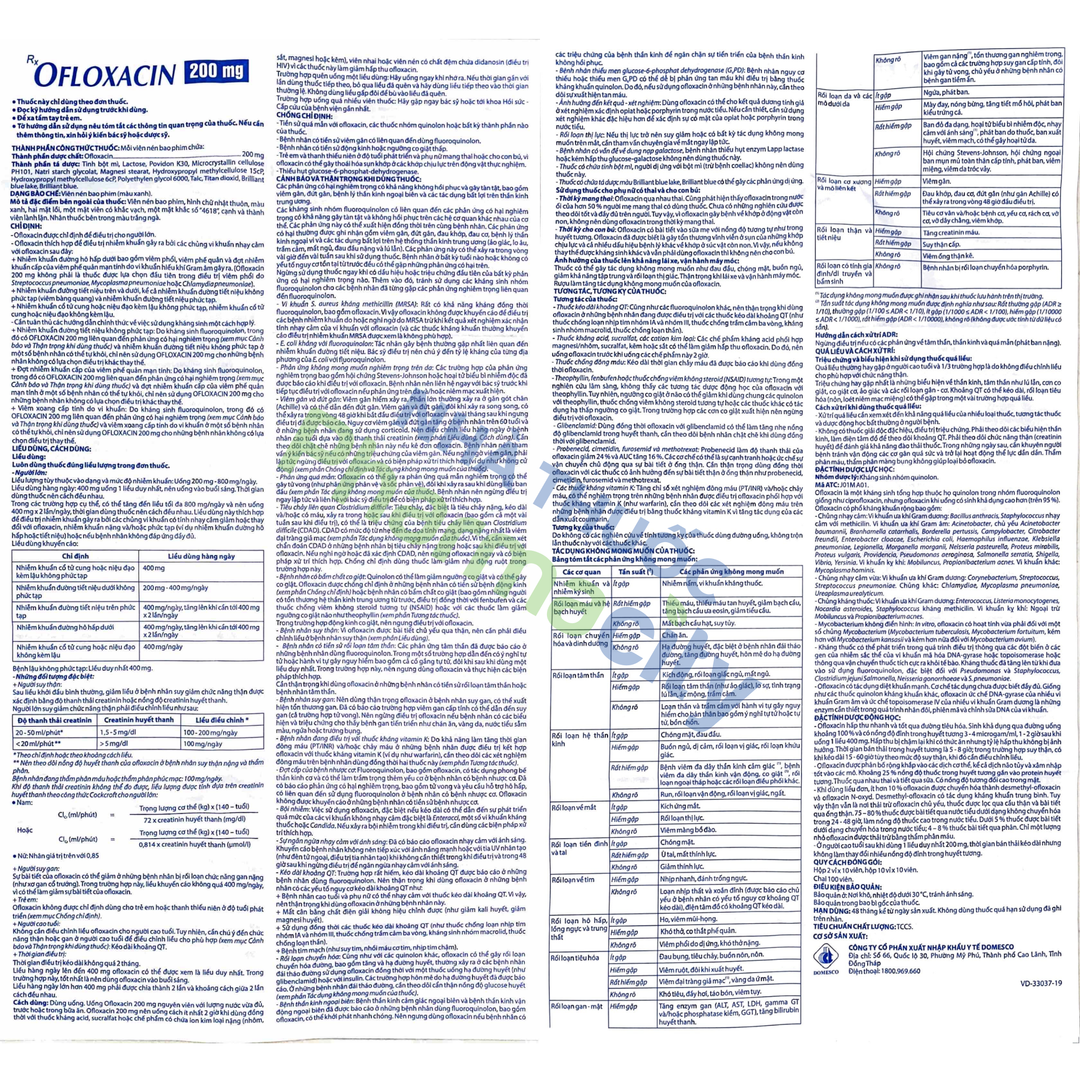 Thuốc Ofloxacin 200mg Domesco là sản phẩm của Công ty Cổ phần Xuất nhập khẩu Y tế Domesco có thành phần chính là Ofloxacin dùng điều trị viêm phổi, viêm phế quản và đợt nhiễm khuẩn cấp của viêm phế quản mạn tính do vi khuẩn hiếu khí Gram âm gây ra; nhiễm khuẩn đường tiết niệu; nhiễm khuẩn cổ tử cung hoặc niệu đạo kèm lậu.