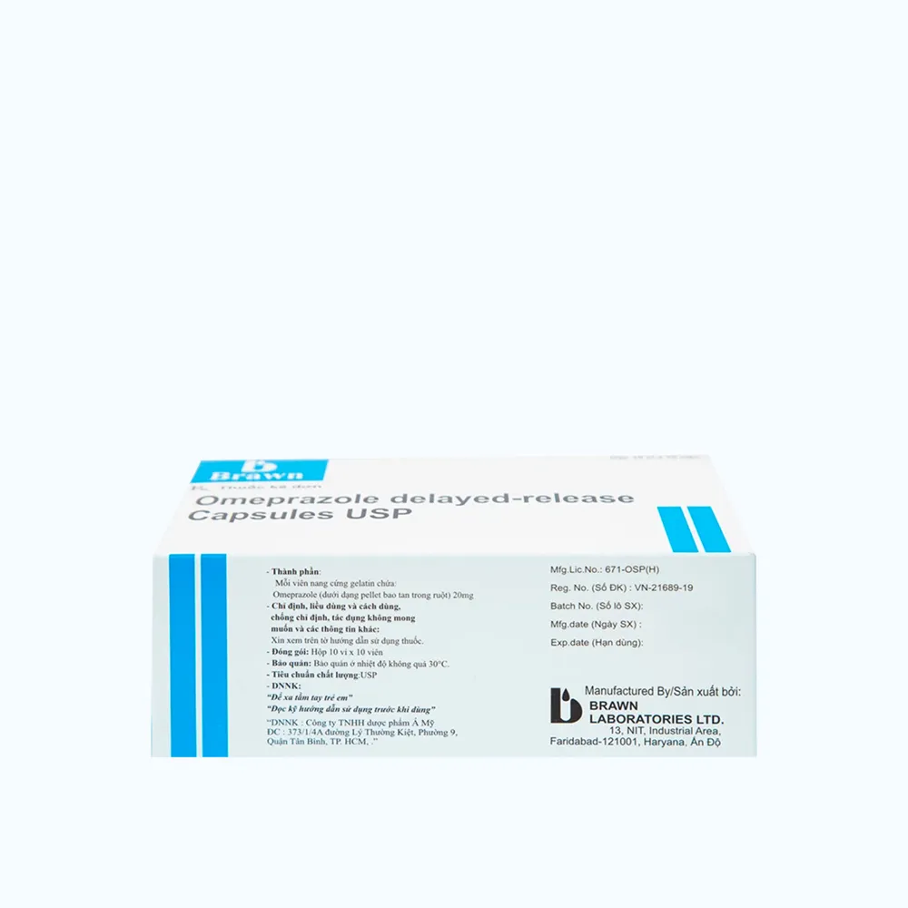 Thuốc Omeprazole Delayed Release Brawn là sản phẩm được sản xuất bởi Brawn laboratories Ltd. (Ấn Độ), thuốc chứa dược chất chính là omeprazole. Thuốc được chỉ định trong điều trị loét tá tràng dạ dày; hội chứng zolinger-Ellison, trào ngược thực quản.