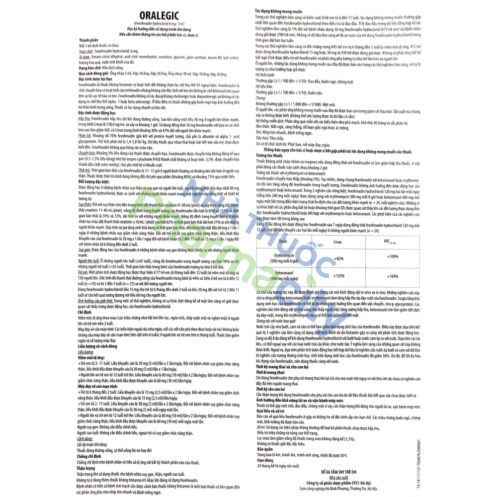 Thành phần của Hỗn dịch uống Oralegic