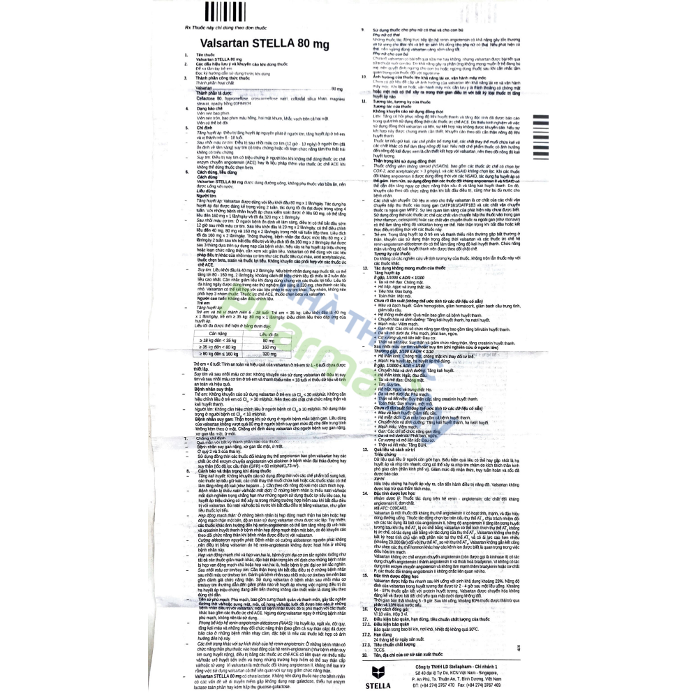 Viên nén Valsartan Stella 80mglà một loại thuốc điều trị tăng huyết áp và suy tim. Thành phần chính của thuốc là Valsartan, một chất đối kháng thụ thể angiotensin II (ARB) giúp giảm huyết áp và cải thiện chức năng tim.