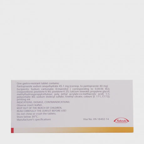 - Hoạt chất: Pantoprazol sodium sesquihydrate 45.1mg (tương đương với Pantoprazol 40,0mg)