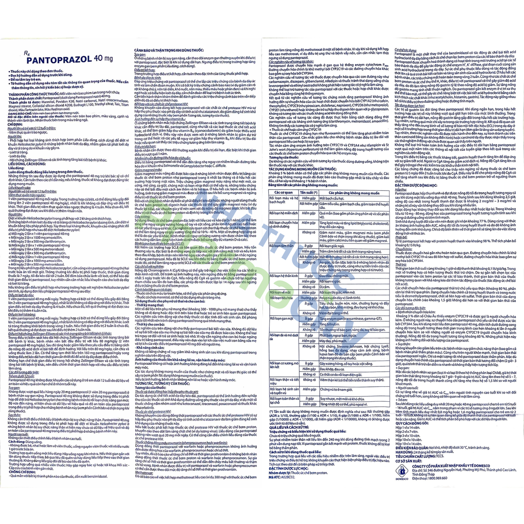 - Thuốc Pantoprazol 40 mg có thành phần là pantoprazol có tác dụng điều trị loét dạ dày, tá tràng; trào ngược dạ dày – thực quản; dự phòng loét dạ dày, tá tràng do dùng thuốc chống viêm không steroid; các tình trạng tăng tiết acid bệnh lý như hội chứng Zollinger-Ellison.