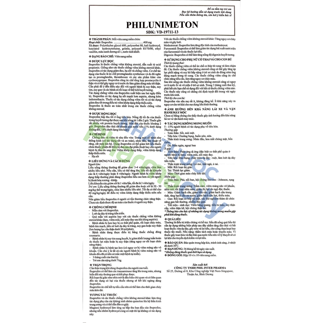 Viêm nang mềm PhilUnimeton 400mg là một loại thuốc chống viêm không steroid (NSAID) được sử dụng để giảm đau và viêm. Hoạt chất chính của thuốc là Ibuprofen, thường được sử dụng trong điều trị các tình trạng như đau đầu, đau răng, đau cơ, đau khớp, và viêm khớp. Viêm nang mềm này giúp giảm đau và sưng bằng cách ức chế sự sản xuất các chất gây viêm trong cơ thể.