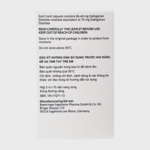 Pradaxa 75 mg sản xuất bởi Boehringer Ingelheim Pharma GmbH & Co. KG (Đức), được chỉ định trong phòng ngừa tai biến thuyên tắc huyết khối tĩnh mạch, phòng ngừa đột quỵ, điều trị huyết khối tĩnh mạch sâu cấp và/hoặc thuyên tắc phổi, giảm nguy cơ tái phát huyết khối tĩnh mạch sâu và thuyên tắc phổi.