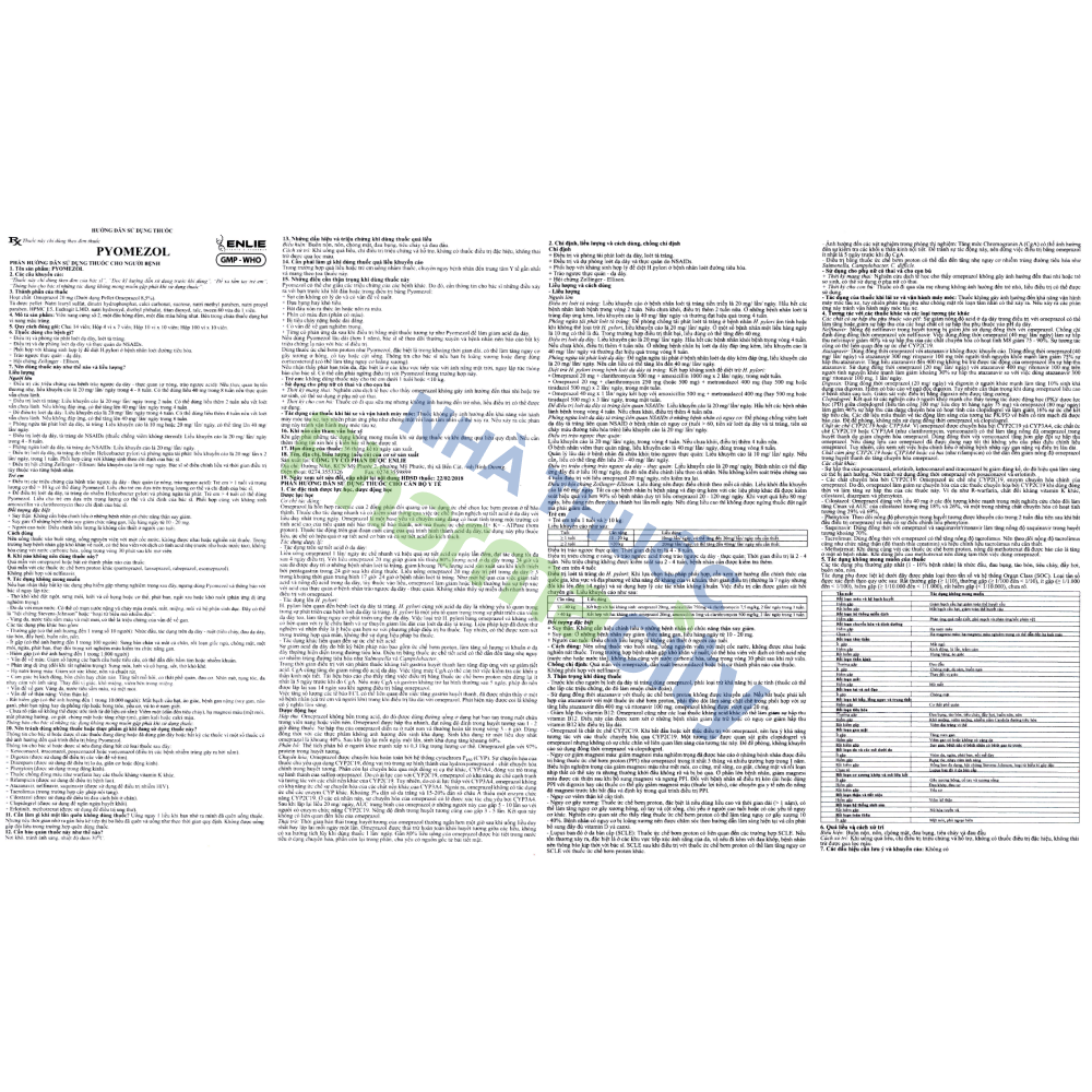 Viên nang Pyomezol 20mglà thuốc chứa hoạt chất Omeprazole, thuộc nhóm thuốc ức chế bơm proton (PPI), được sử dụng để điều trị các bệnh liên quan đến acid dạ dày như viêm loét dạ dày, trào ngược dạ dày thực quản, và các tình trạng tăng tiết acid dạ dày.